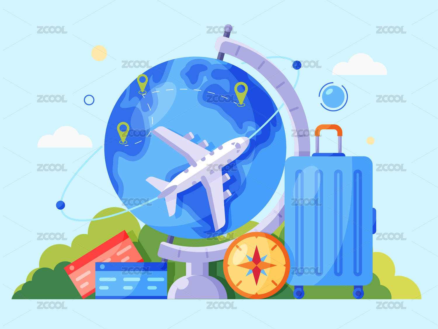 飞机和地球仪旅行包合集矢量扁平插画