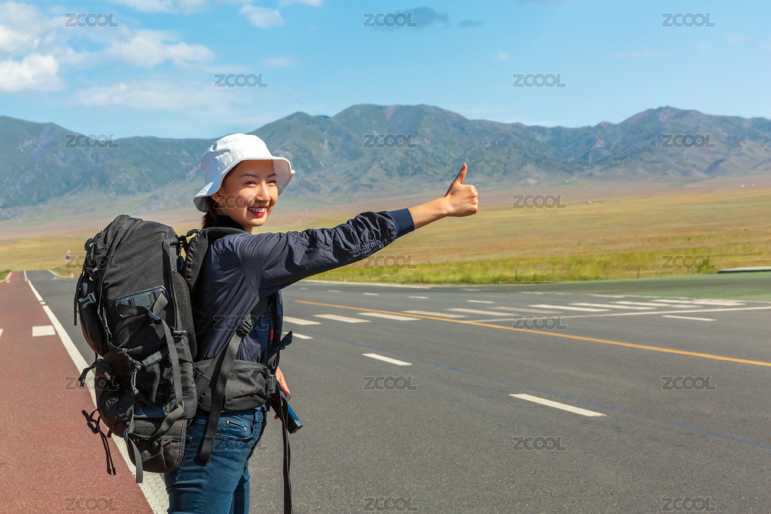 晴朗天气背着旅行包在路边搭车的亚裔女孩面带微笑