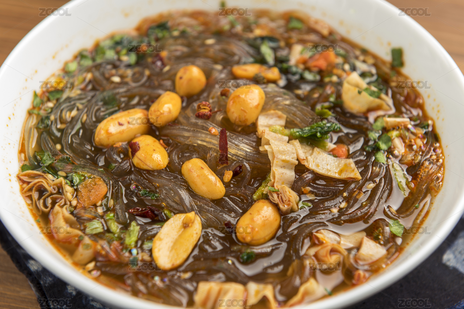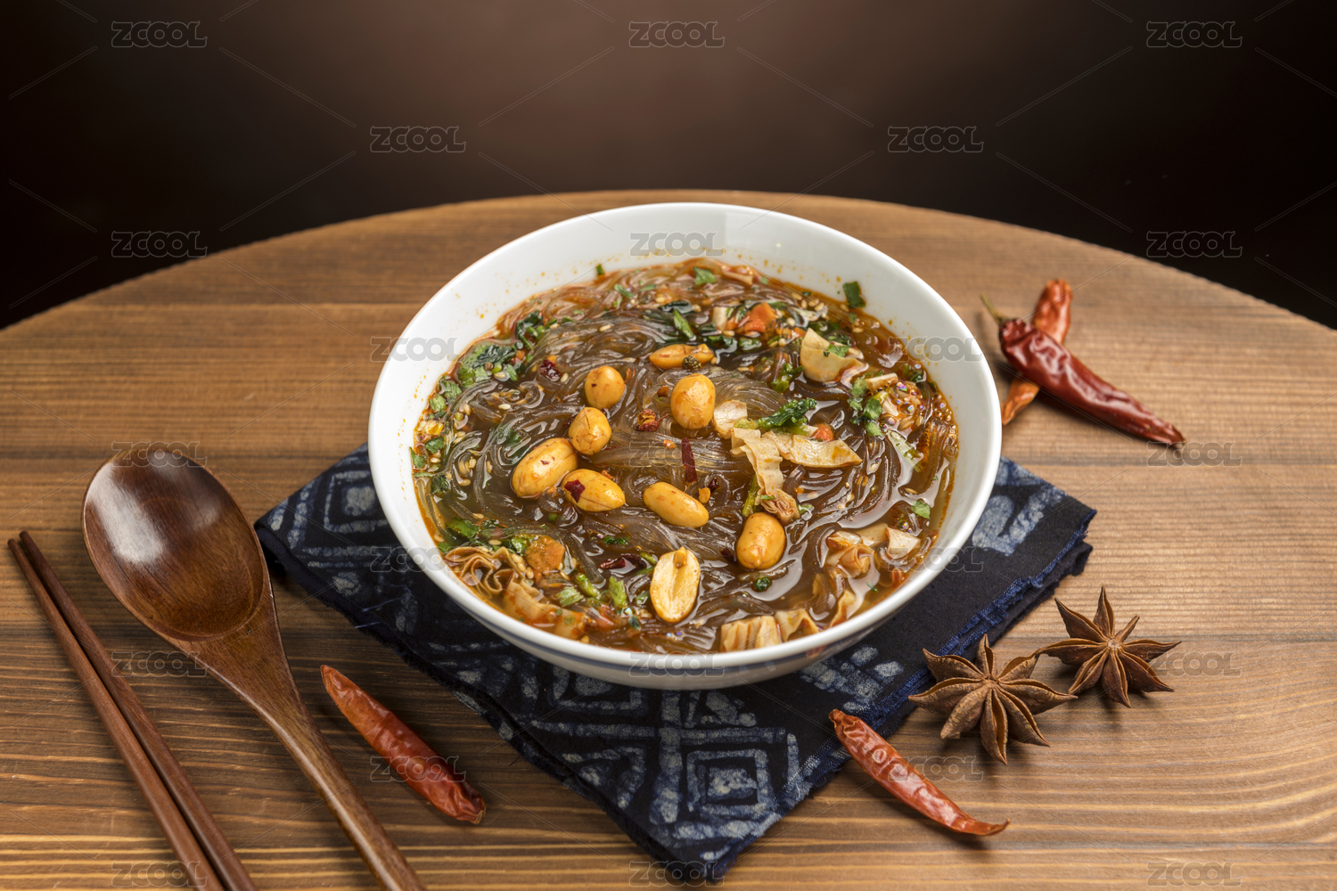一碗四川小吃酸辣粉摆放在木桌面上特写