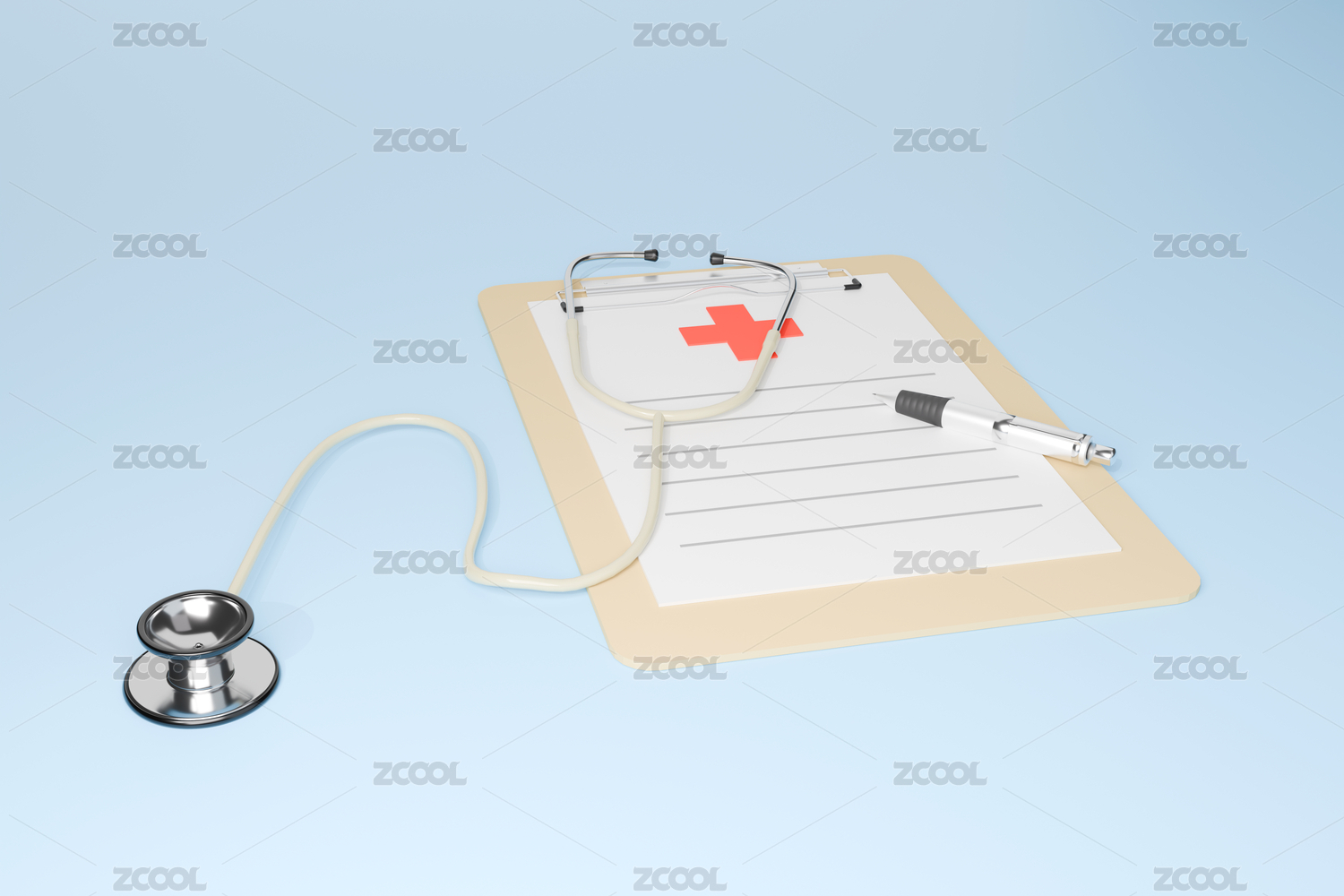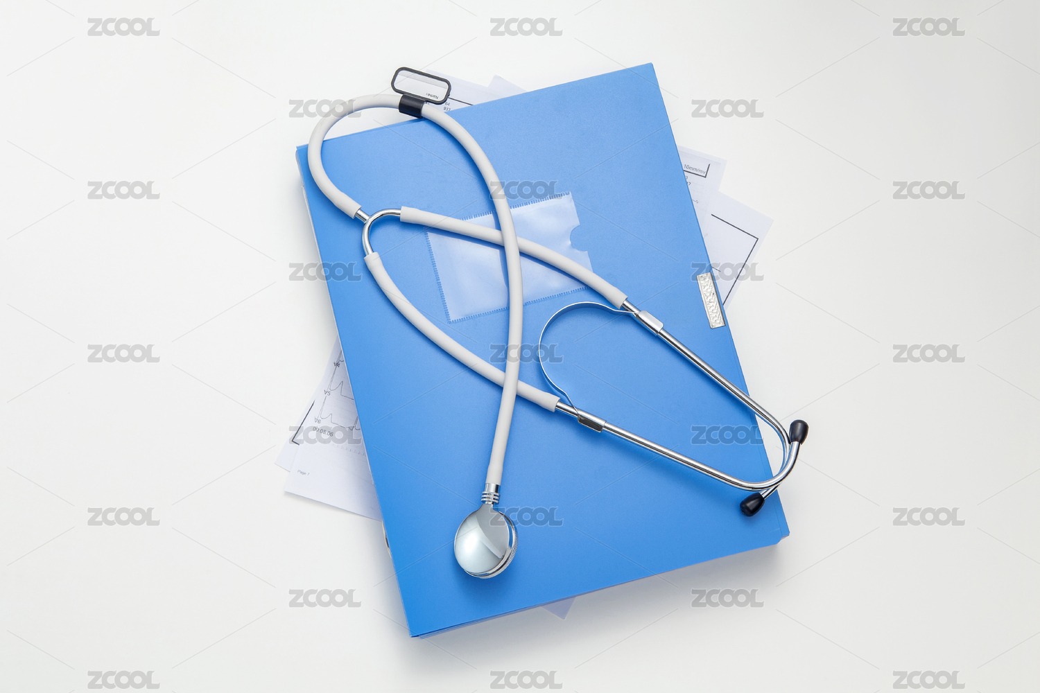 俯视拍摄白色桌面上的蓝色文件夹和听诊器