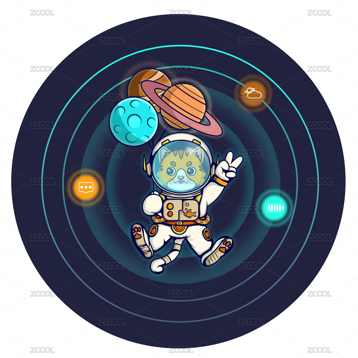 穿着宇航服手比耶的猫咪在太空中玩星球