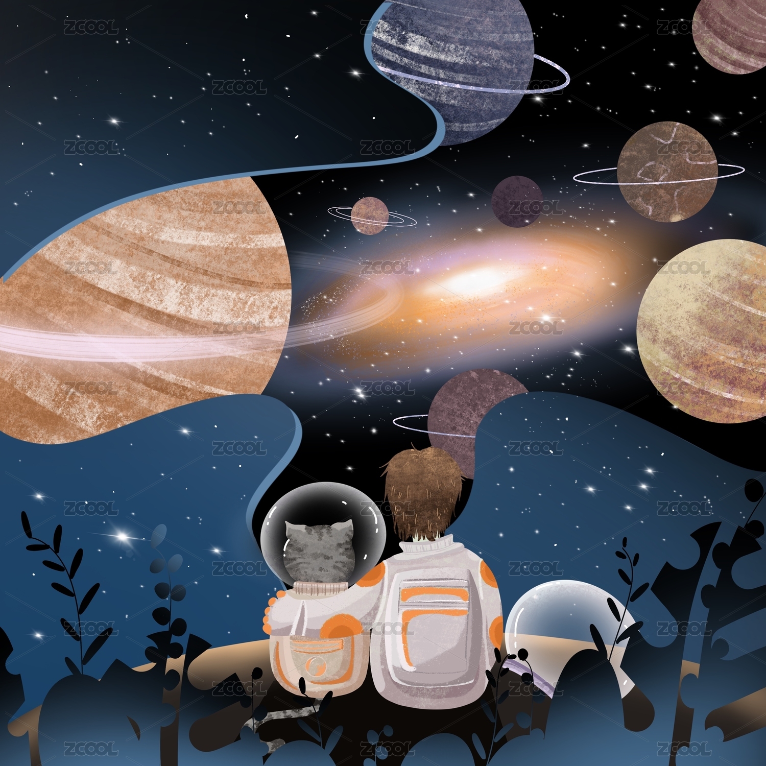 穿着宇航服的猫咪和男孩坐在草地上看宇宙星空