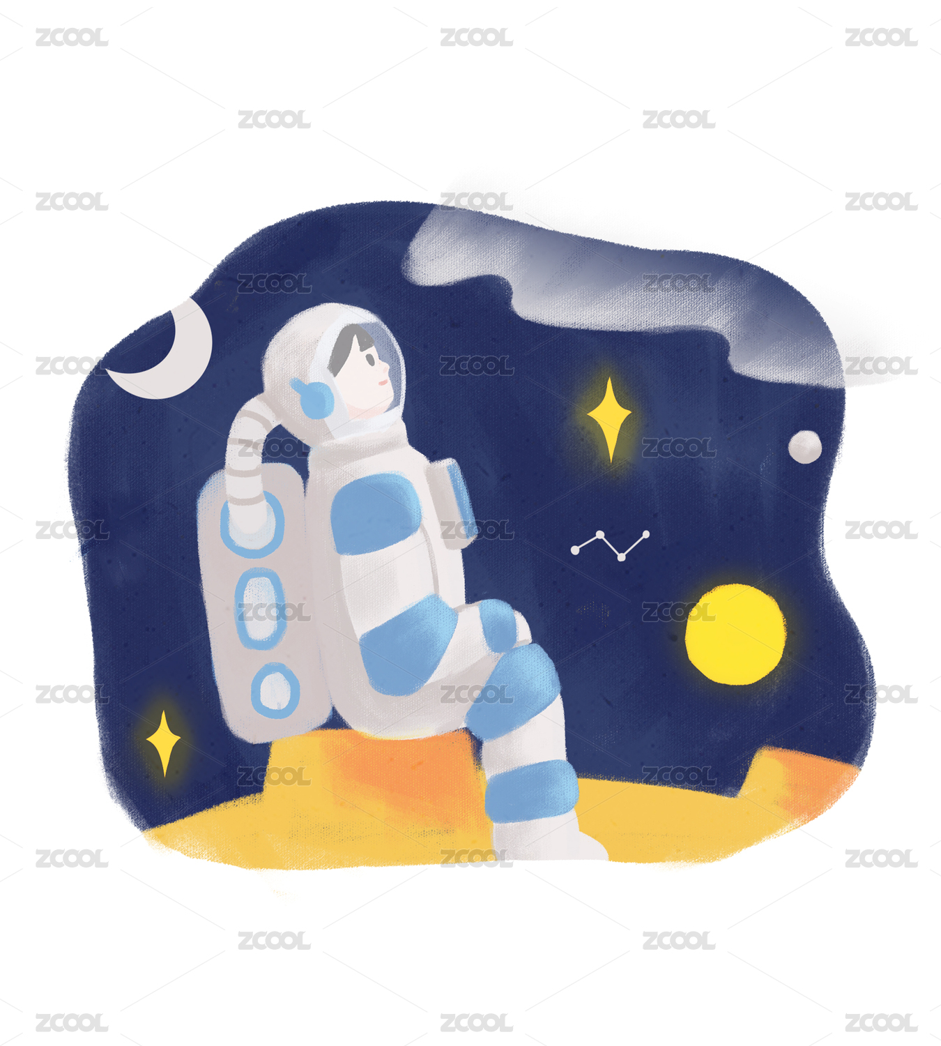 在身着宇航服的女孩月球上仰望星空