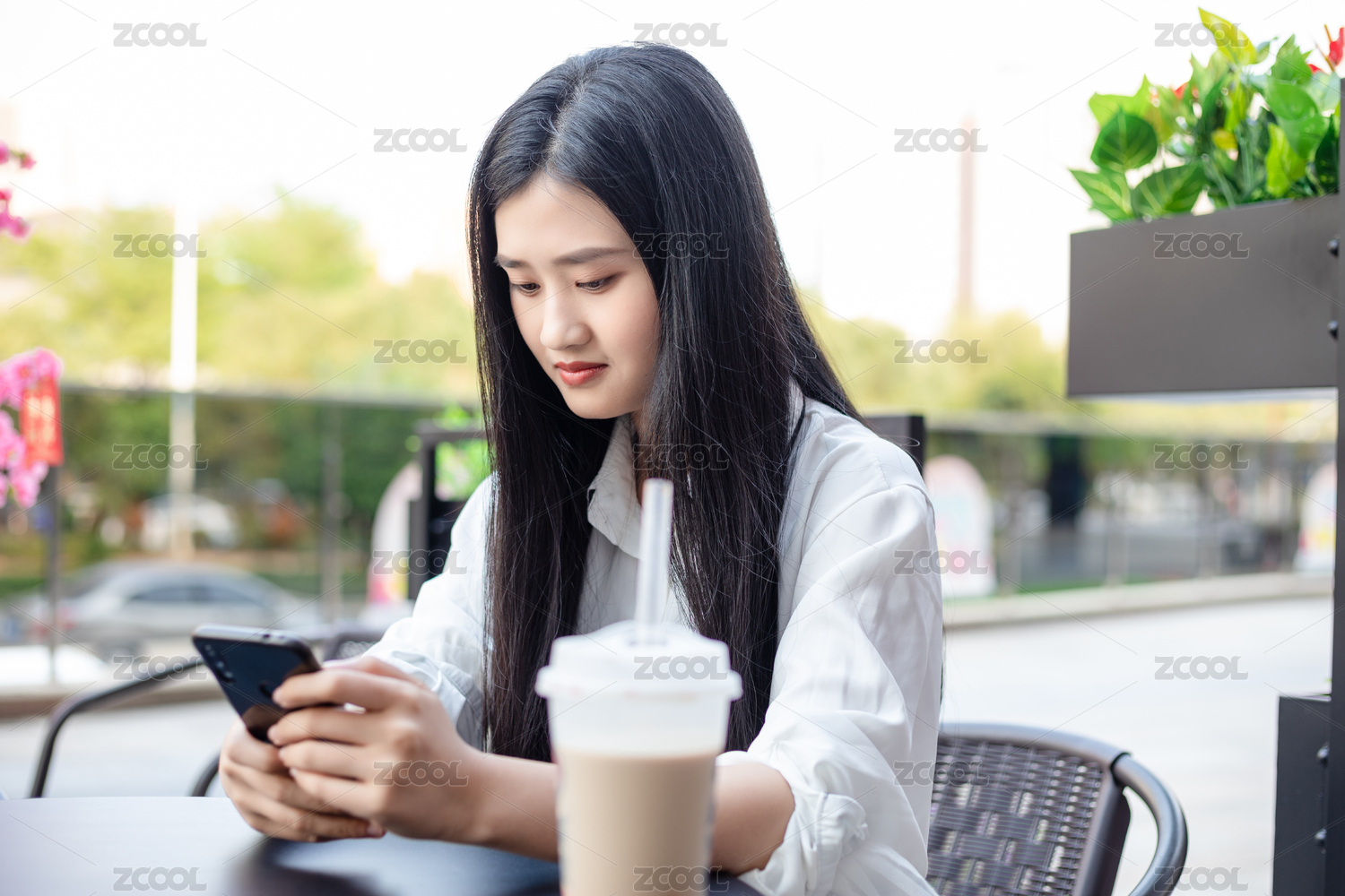 一名年轻女子一边玩手机一边喝奶茶