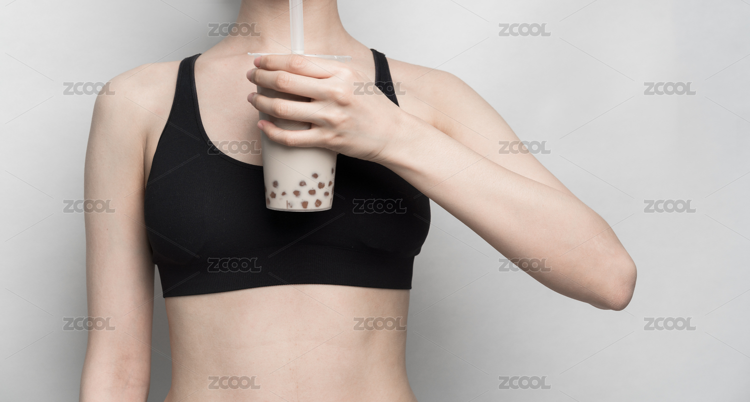 白色背景里,正在喝奶茶的时尚亚洲女孩