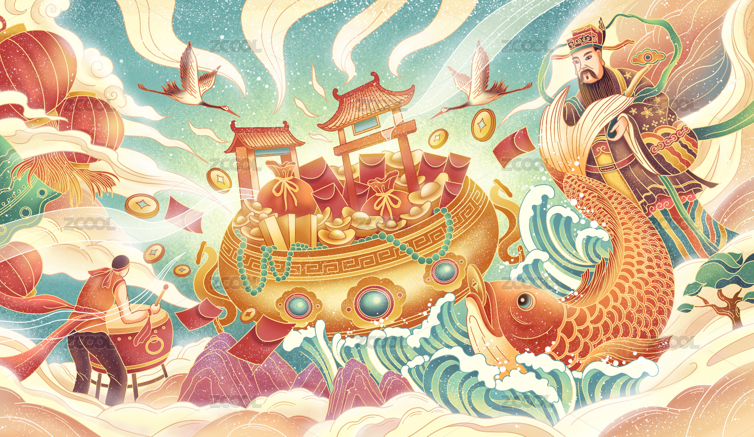 热闹的舞狮与鲤鱼跳跃的新年景象