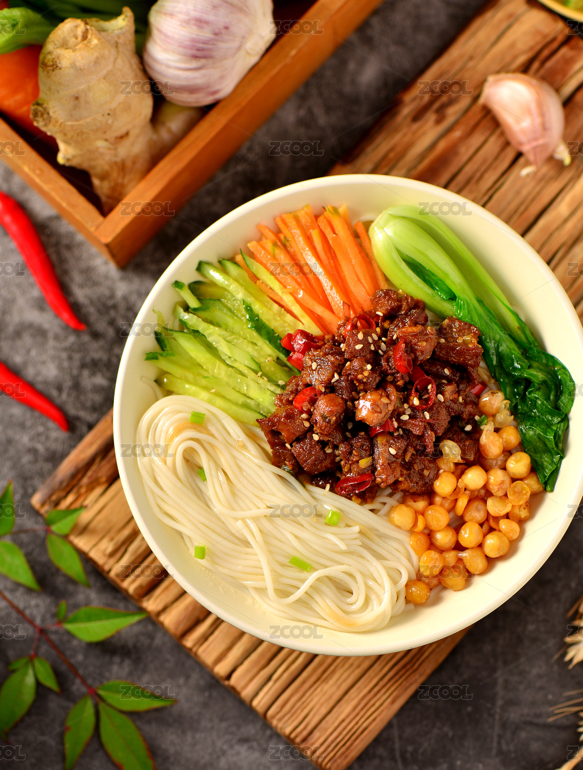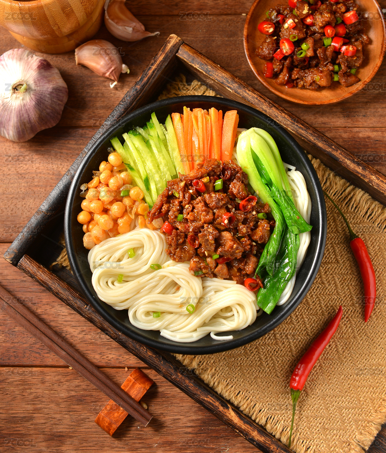放在木桌上的北京美食老北京炸酱面