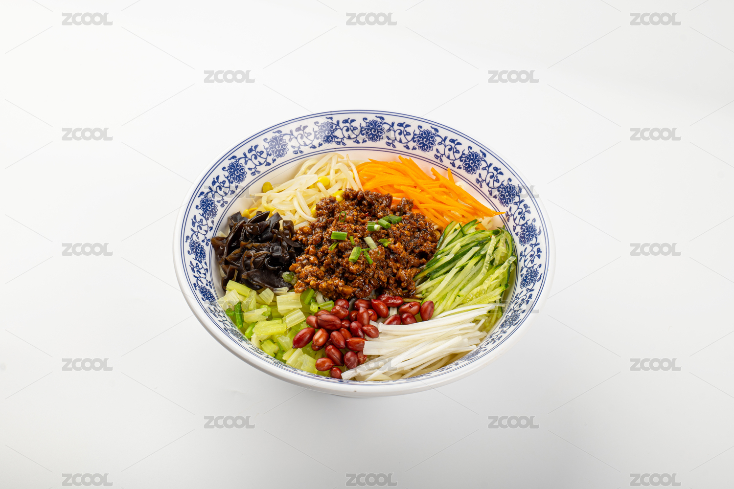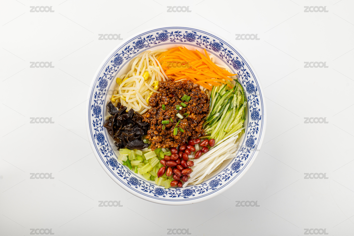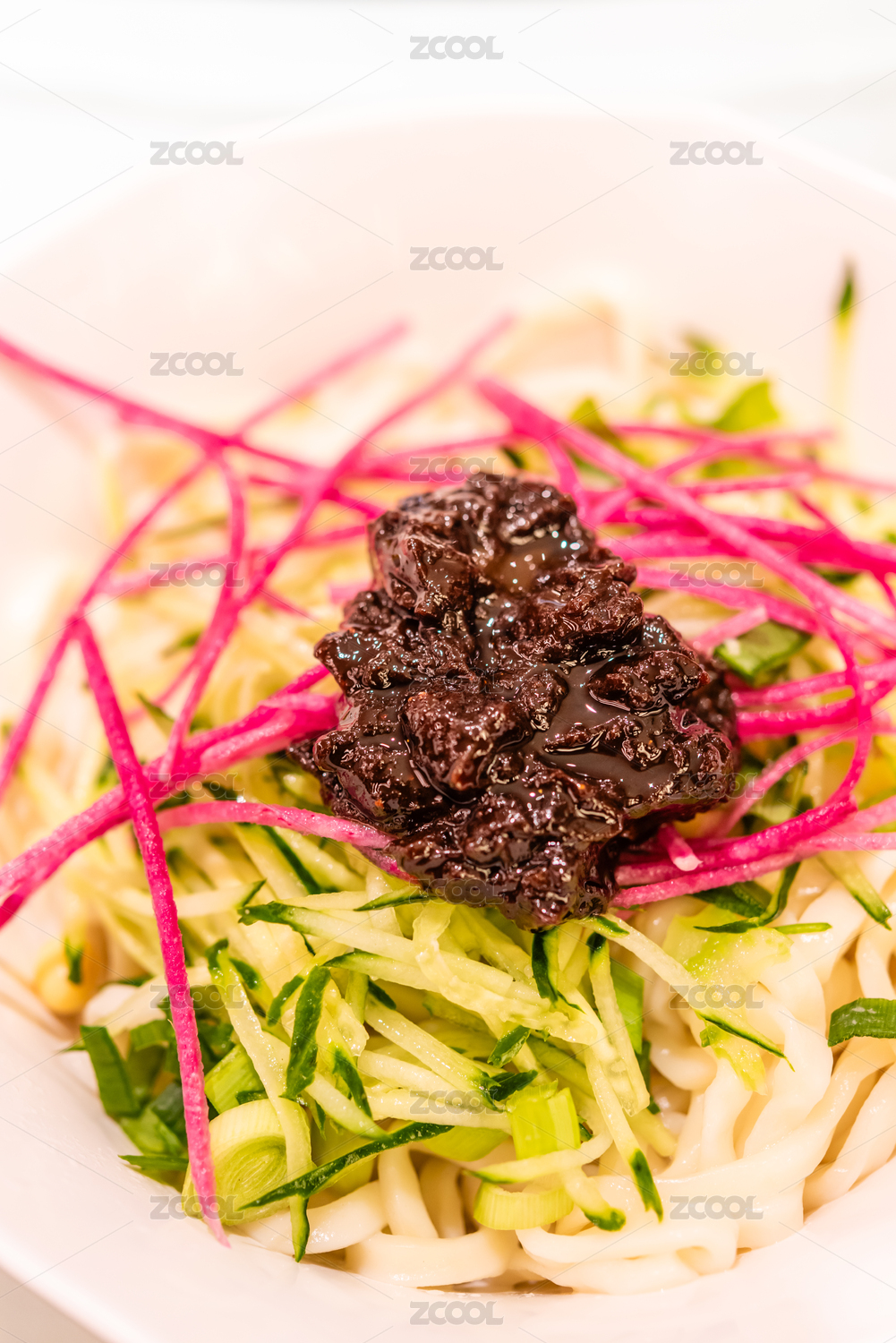 青花瓷碗的老北京炸酱面特写