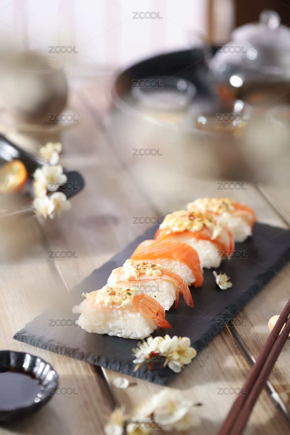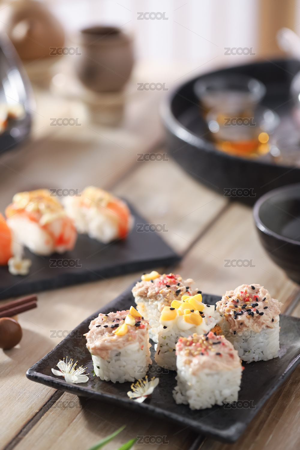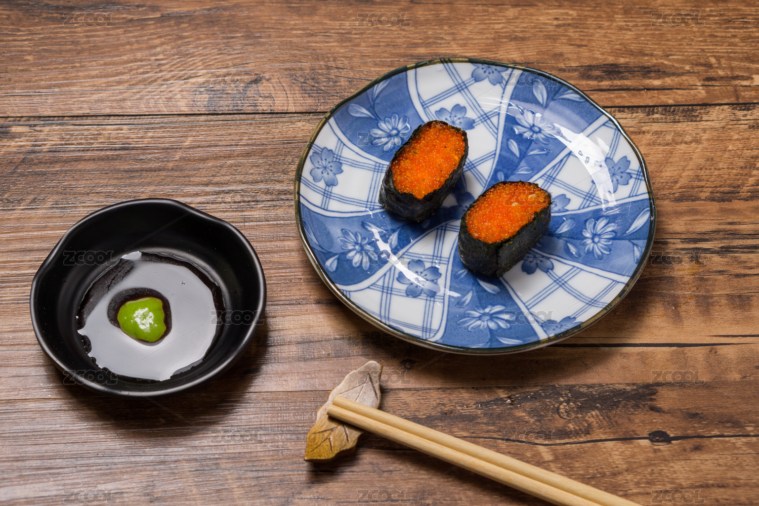 木纹桌面上的日式寿司料理