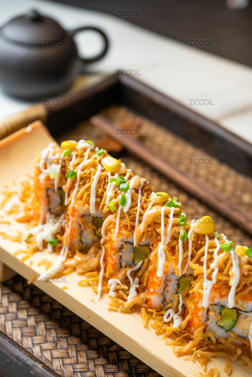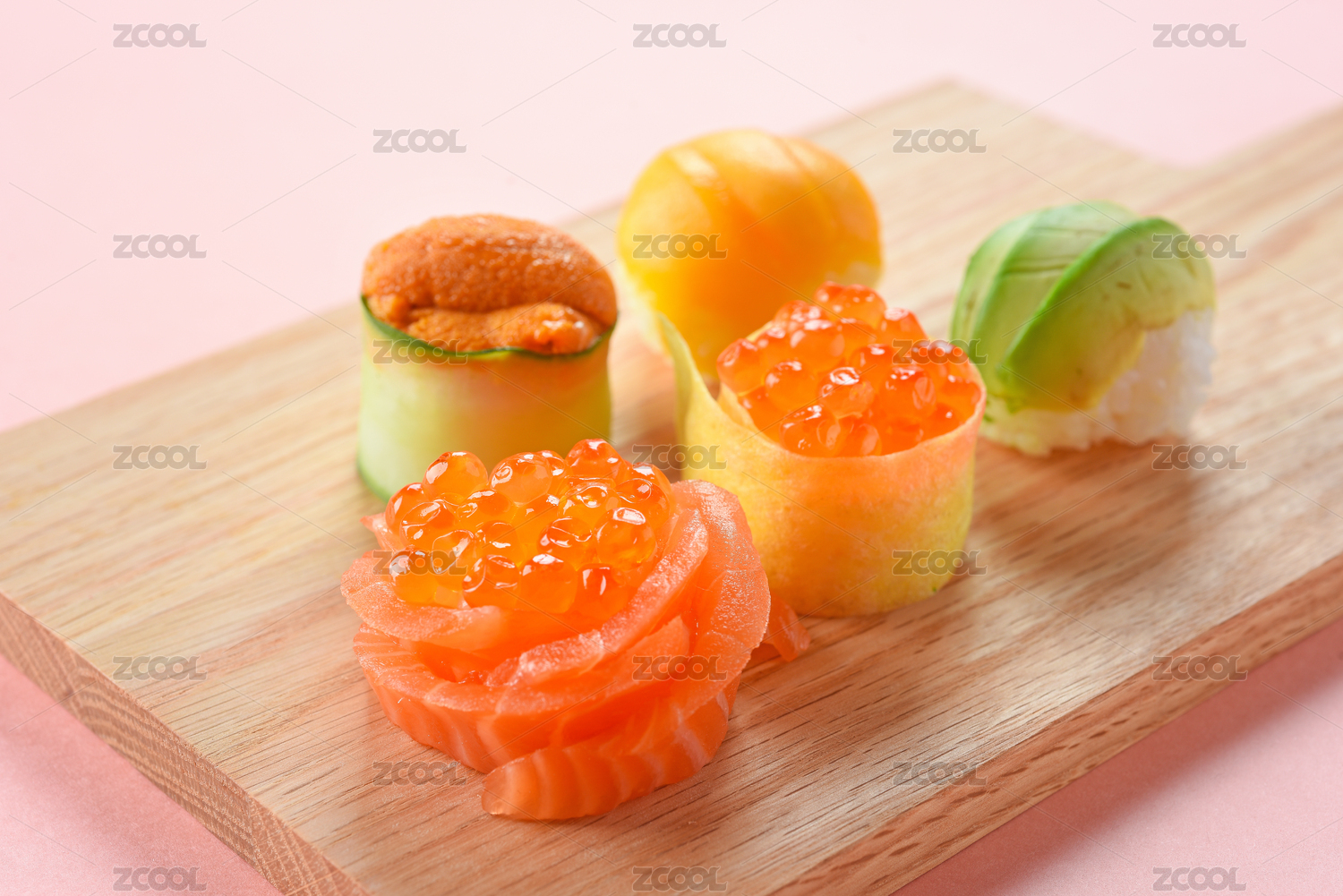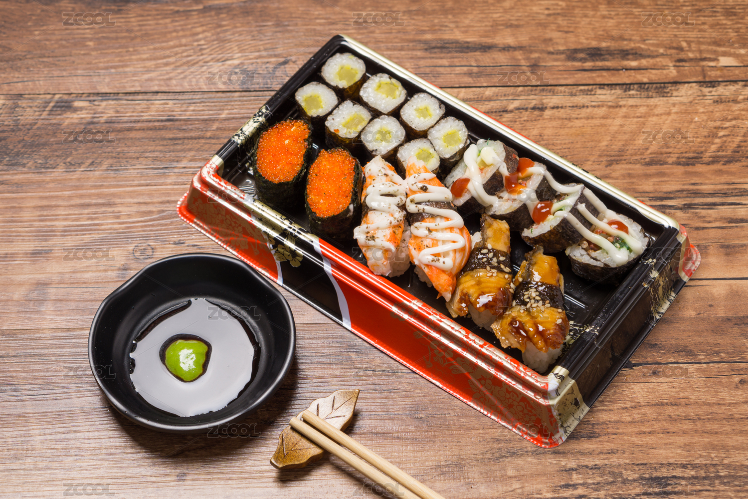 木纹桌面上的日式寿司料理
