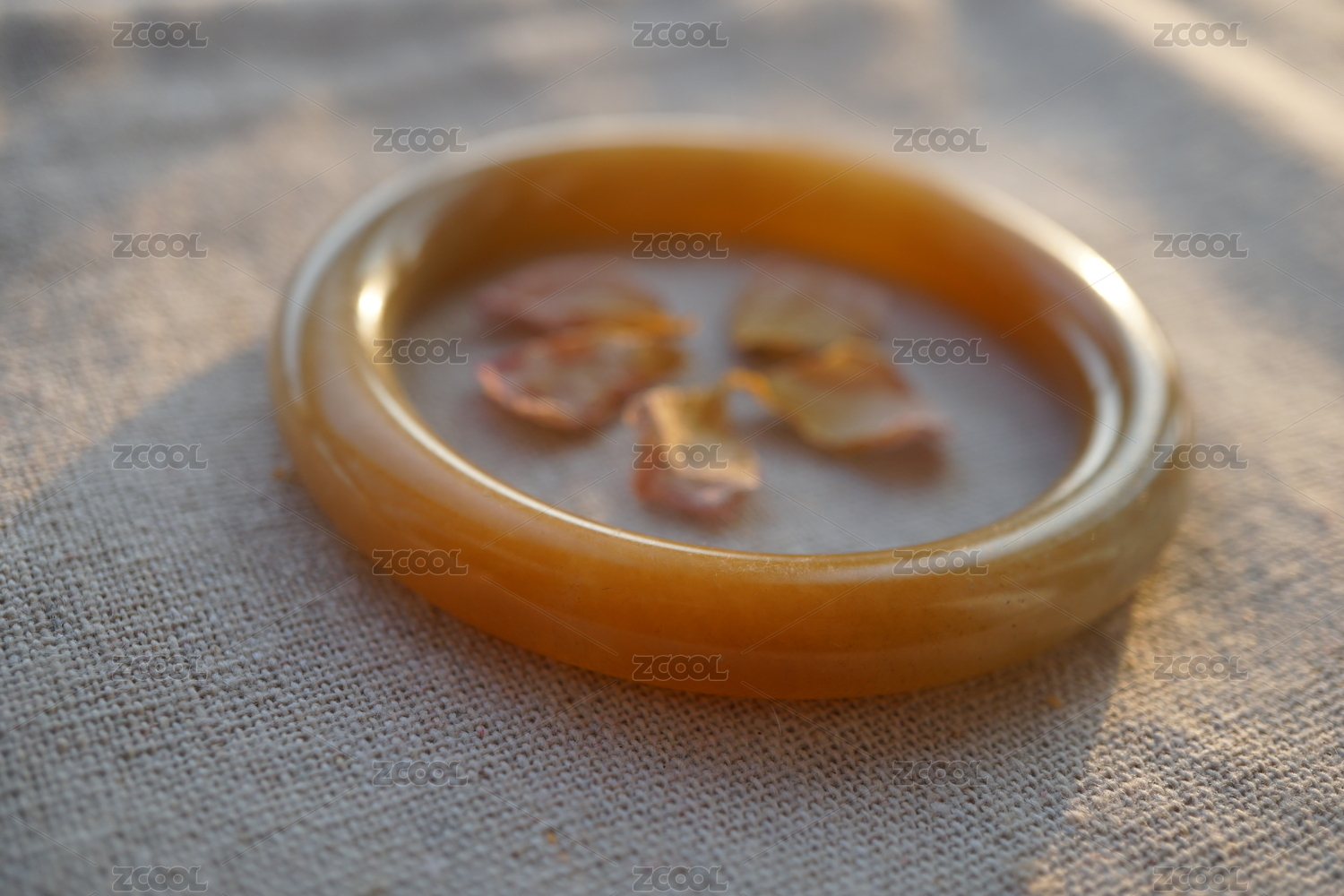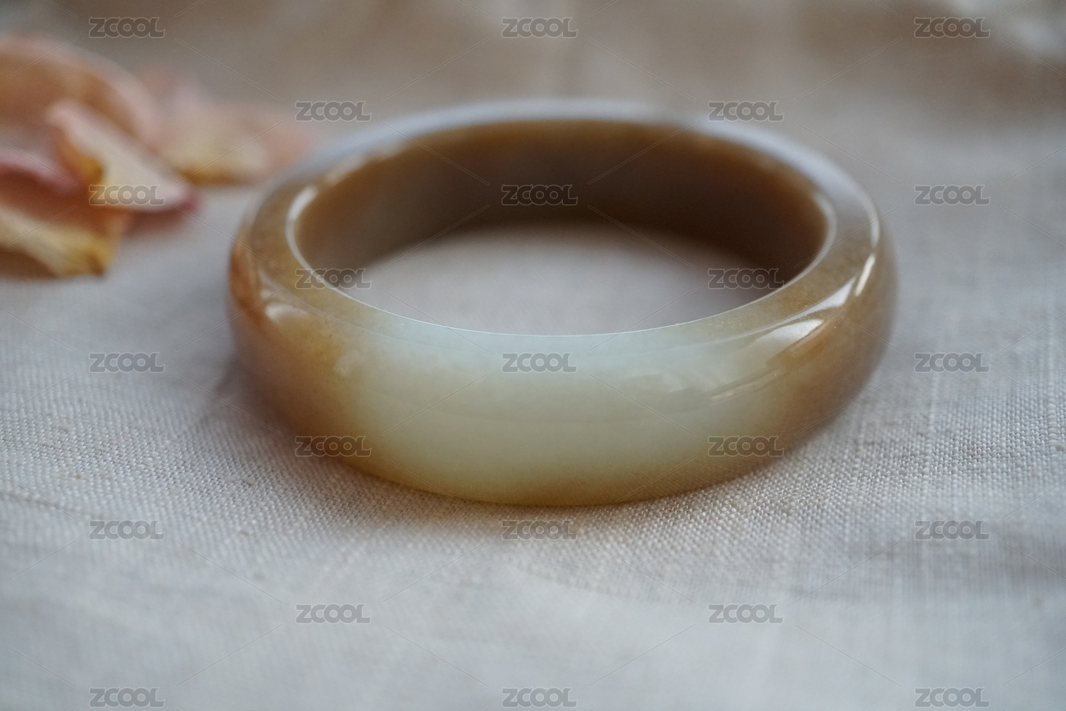 中国新疆和田玉且末糖料手镯与花瓣的静谧