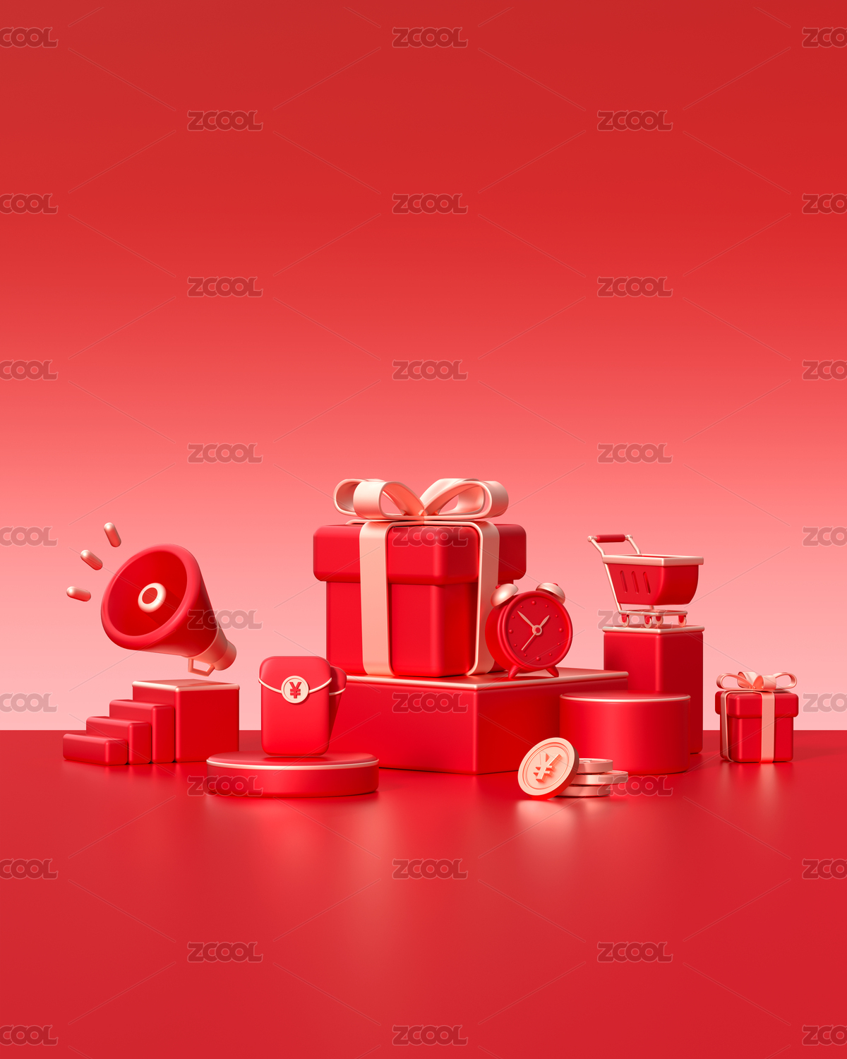电商促销红金色元素堆渐变背景活动海报