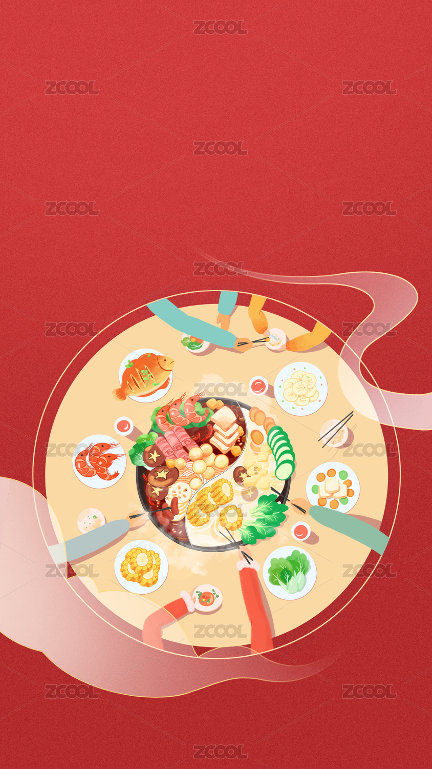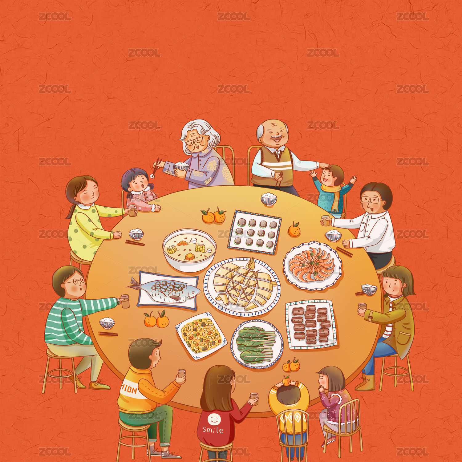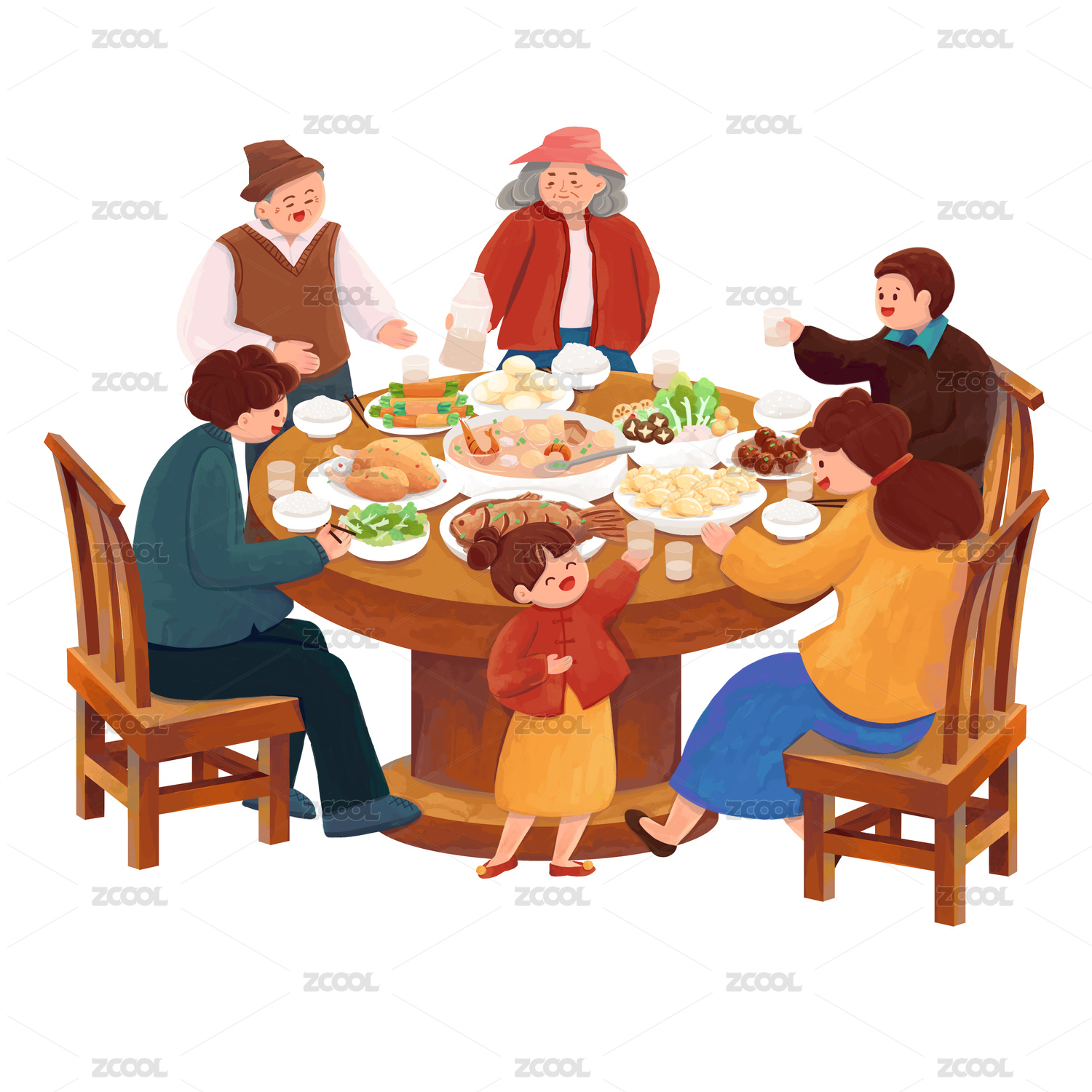 手绘水彩圆桌年夜饭插画