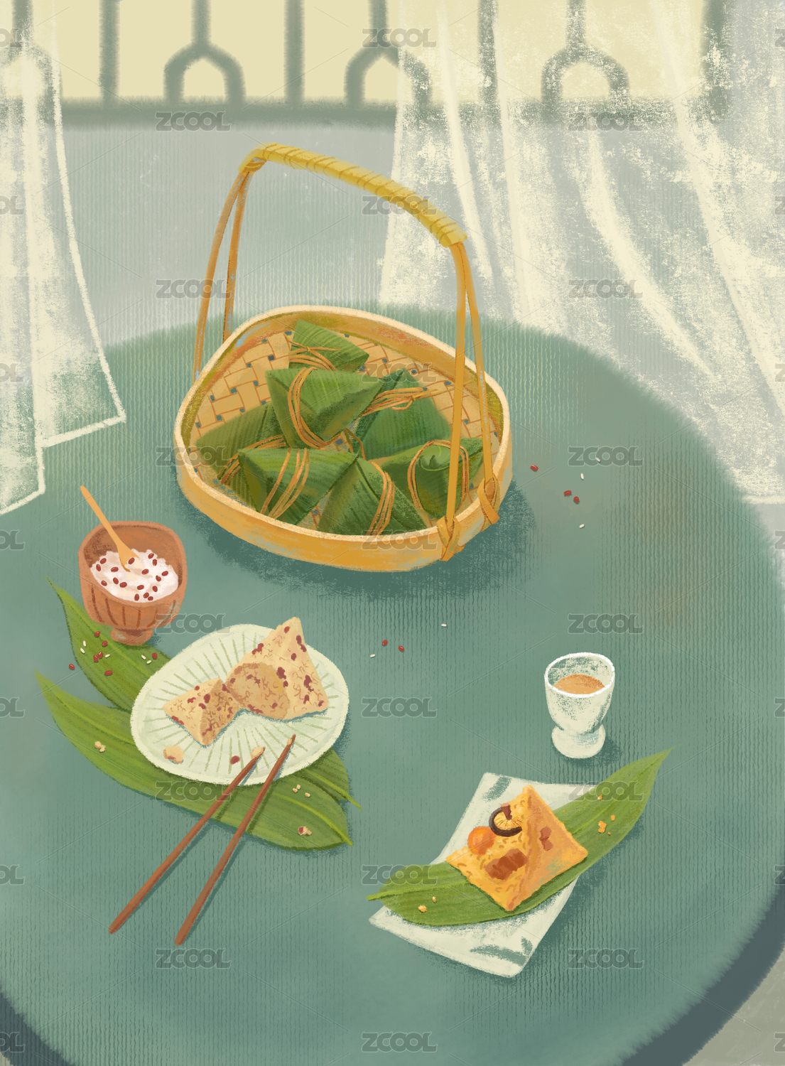 端午节一篮粽子在圆桌上