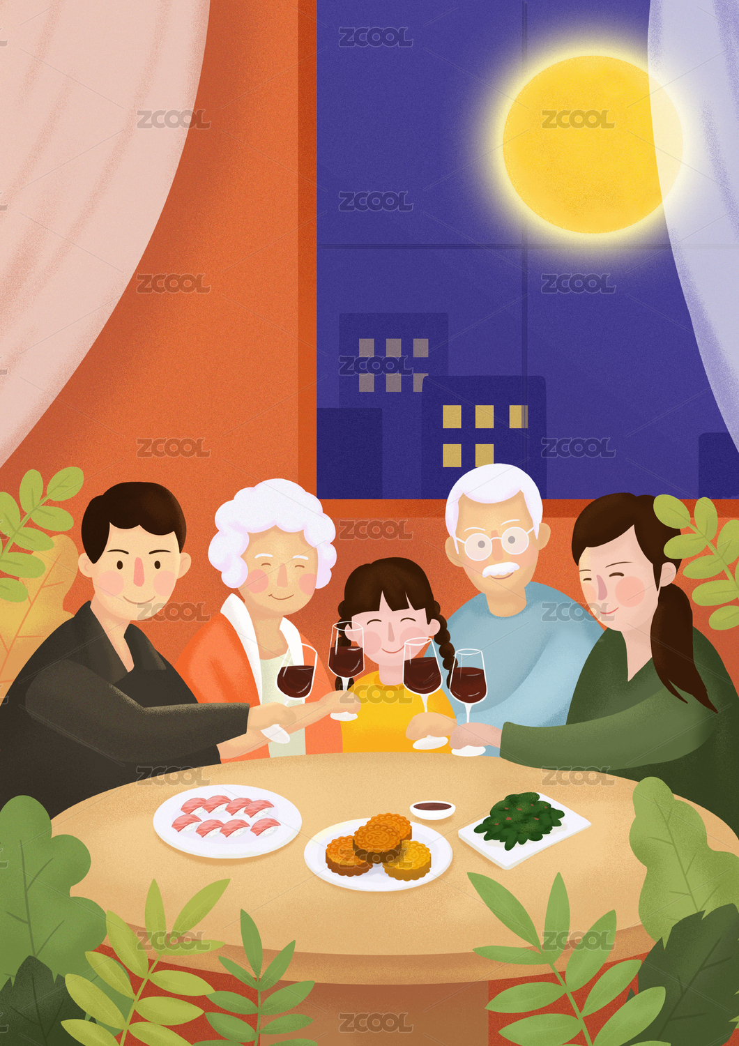 一家人坐在圆桌前举杯月亮在窗外升起