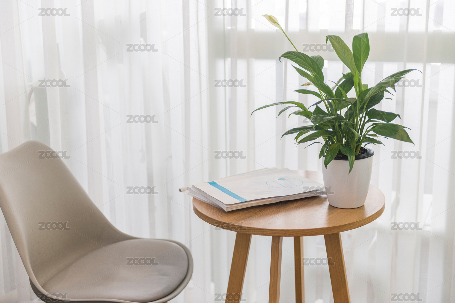 百叶窗前的沙发和摆放有白掌绿植和荞麦茶的茶几