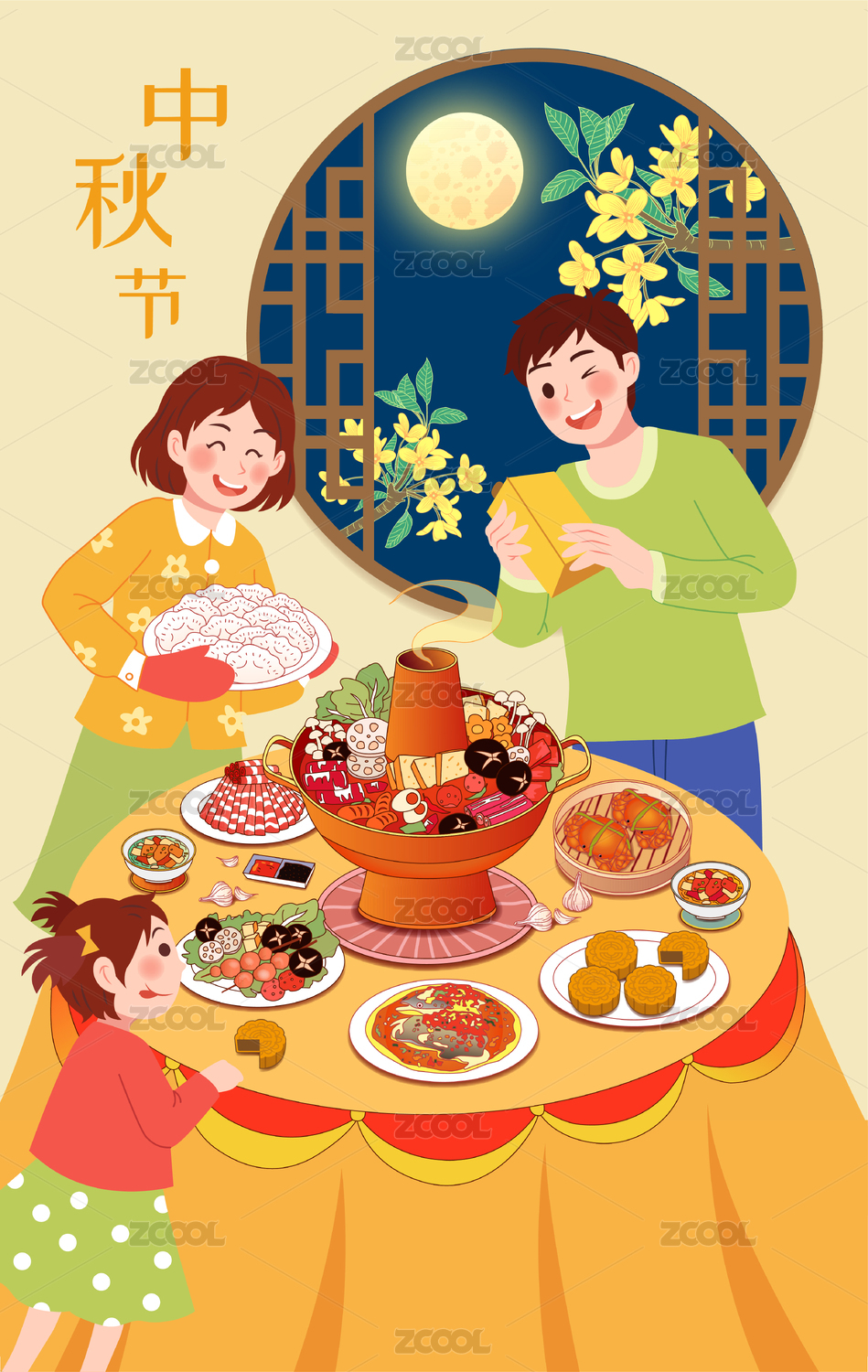 中秋节一家人吃火锅圆桌团圆饭美食插画