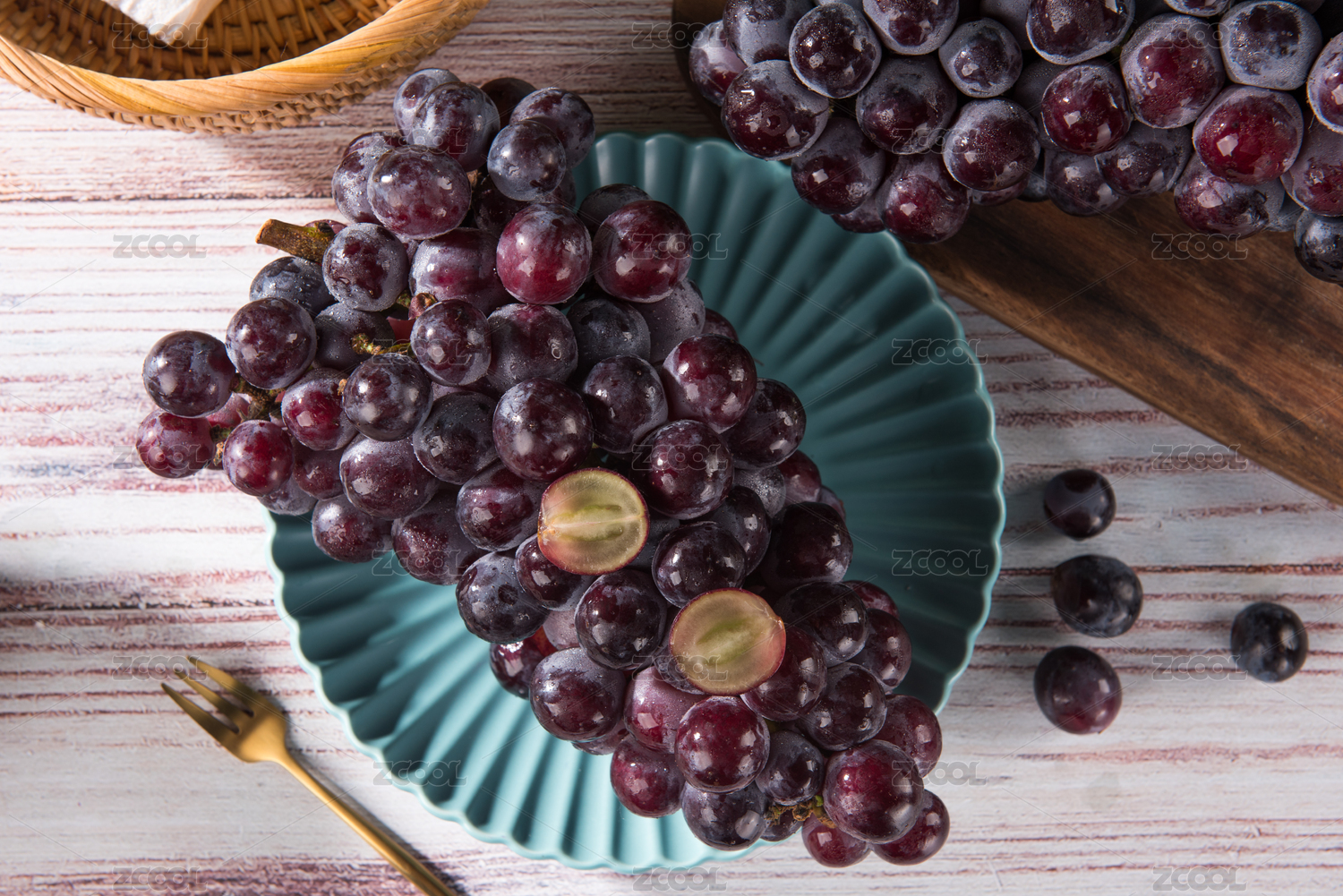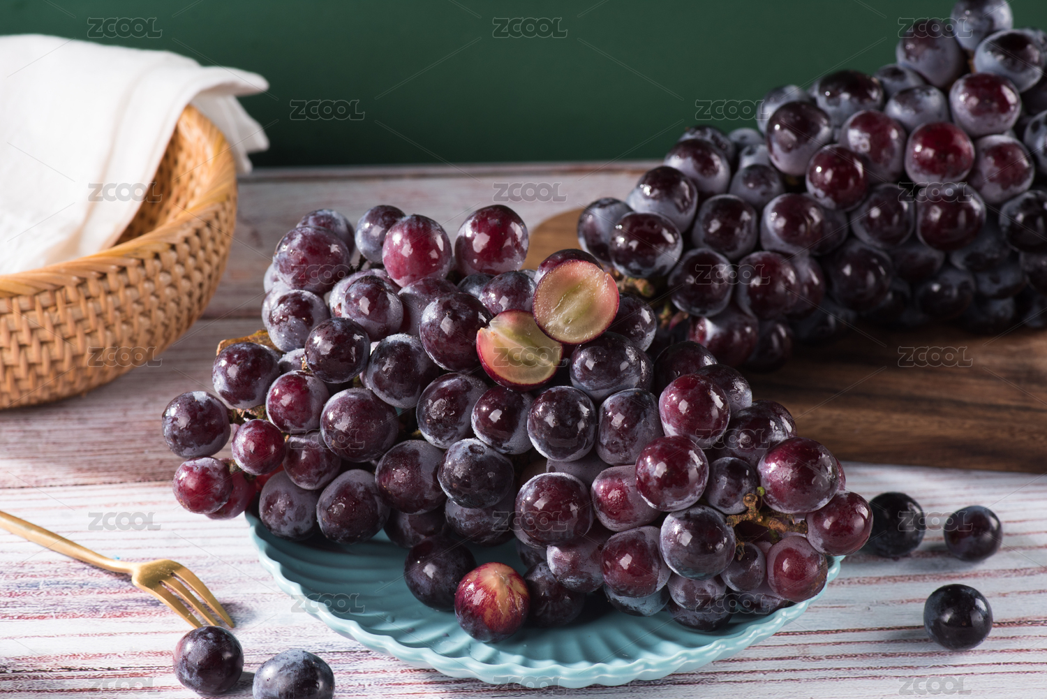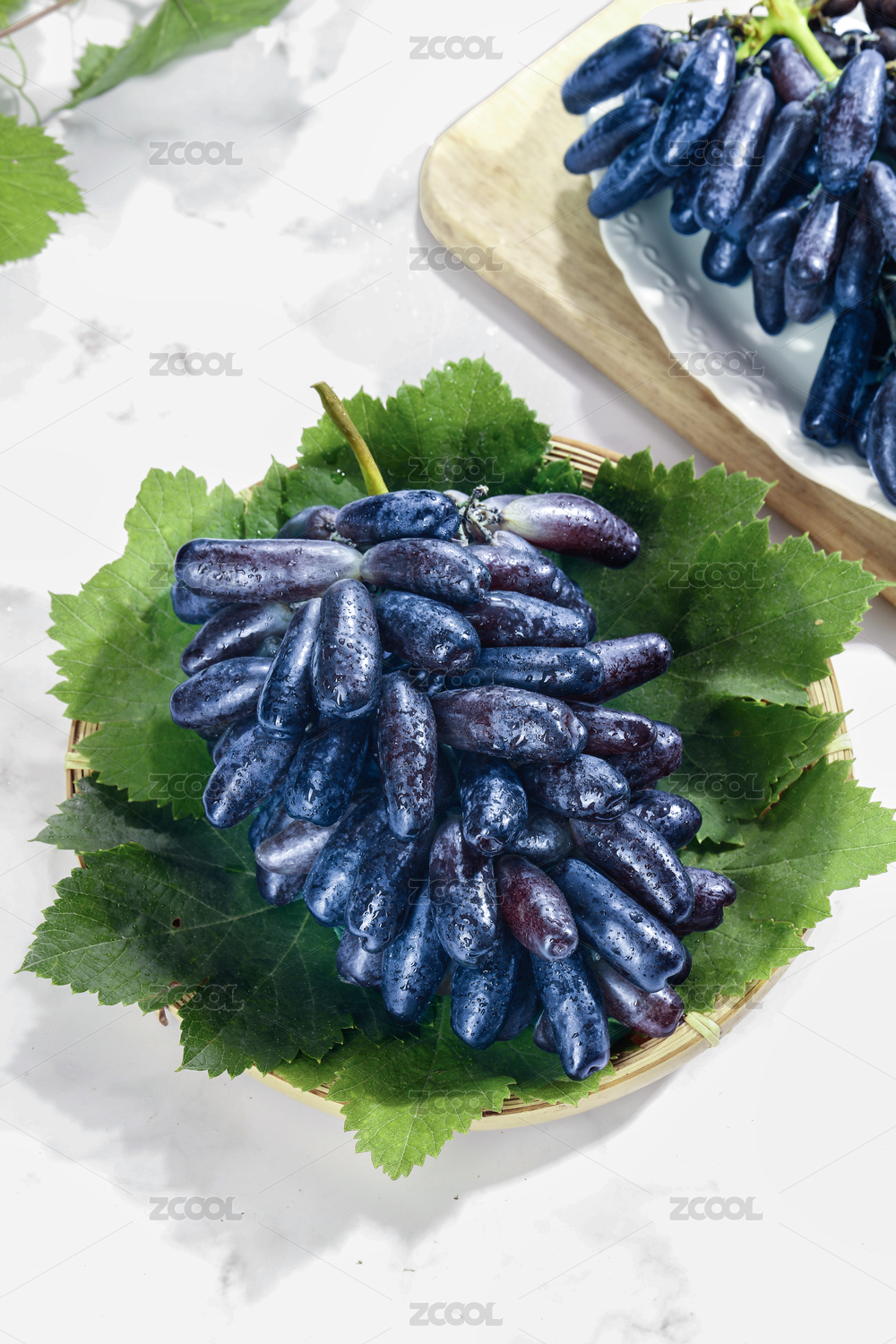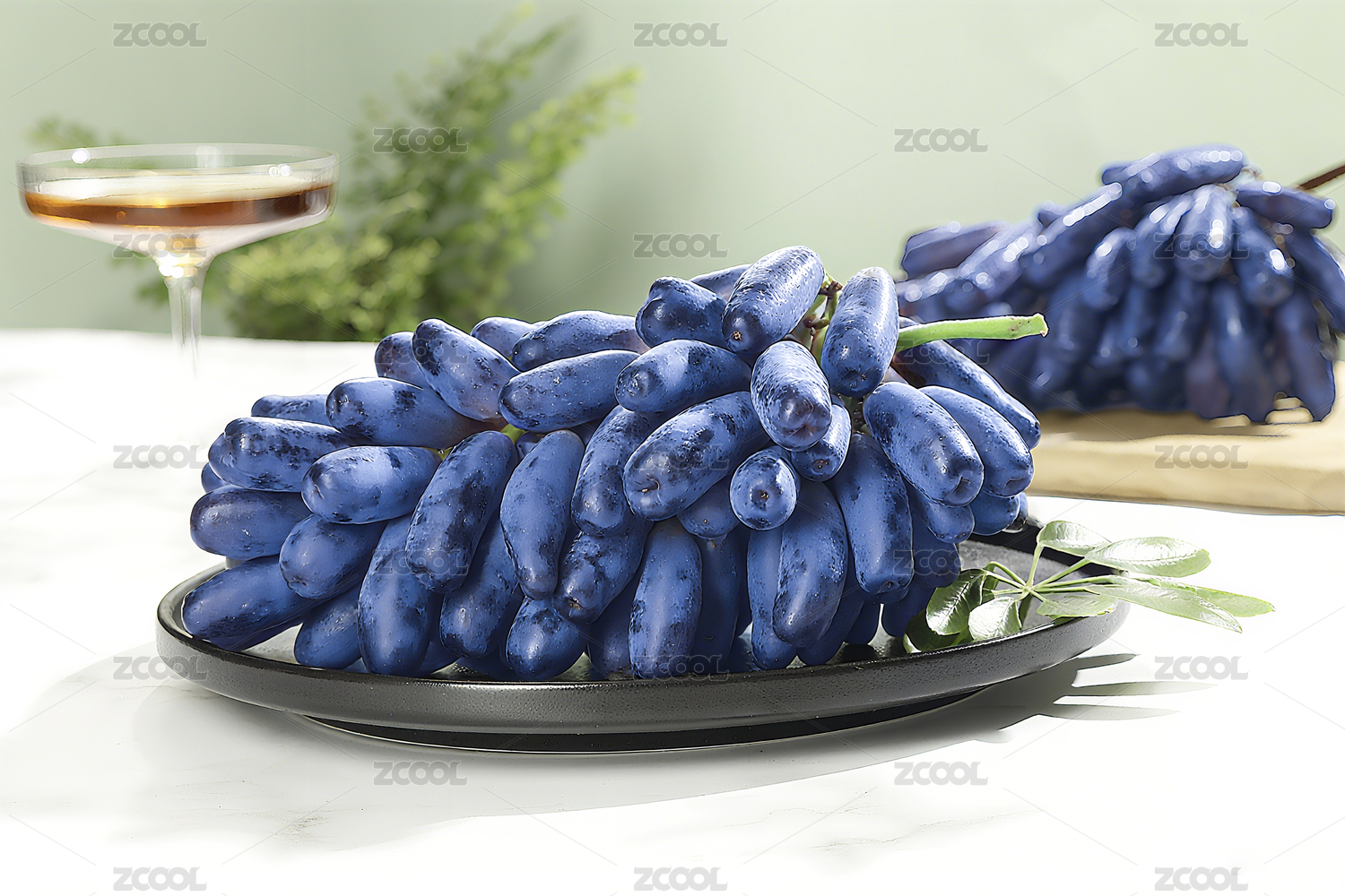 白色背景下的一串新鲜进口无籽黑提黑葡萄