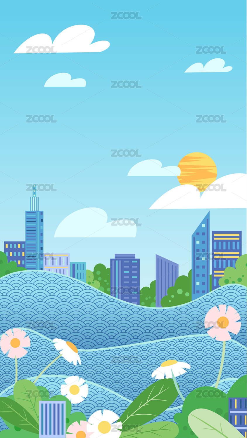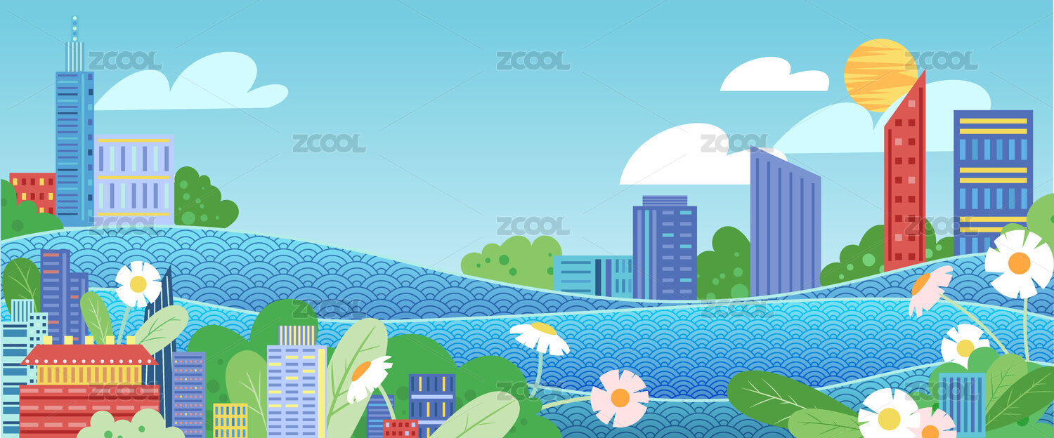 河边城市风景插画