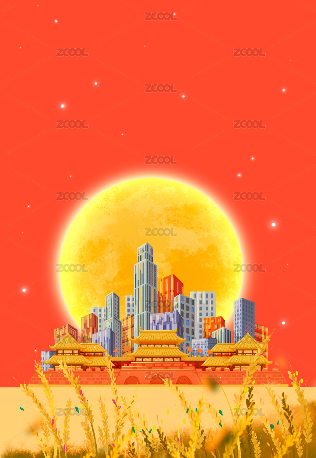 国庆中秋宫殿城市月亮风景插画