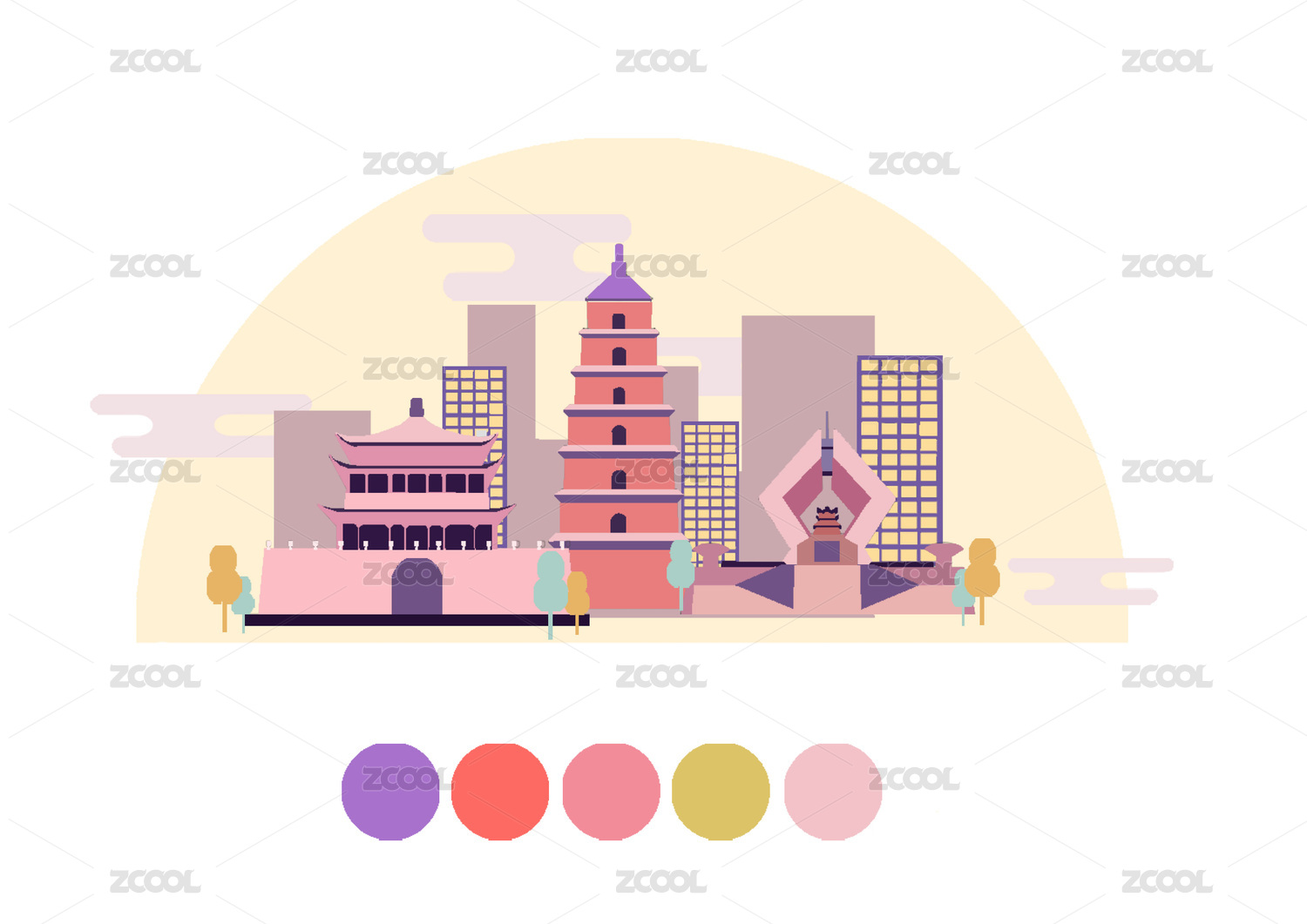 西安城市扁平插画 清新配色城市风景