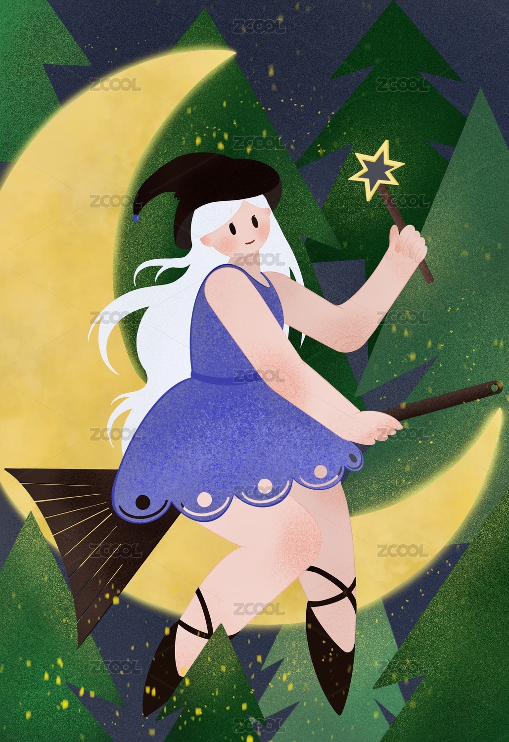 骑扫把的女孩穿梭在夜晚的森林里