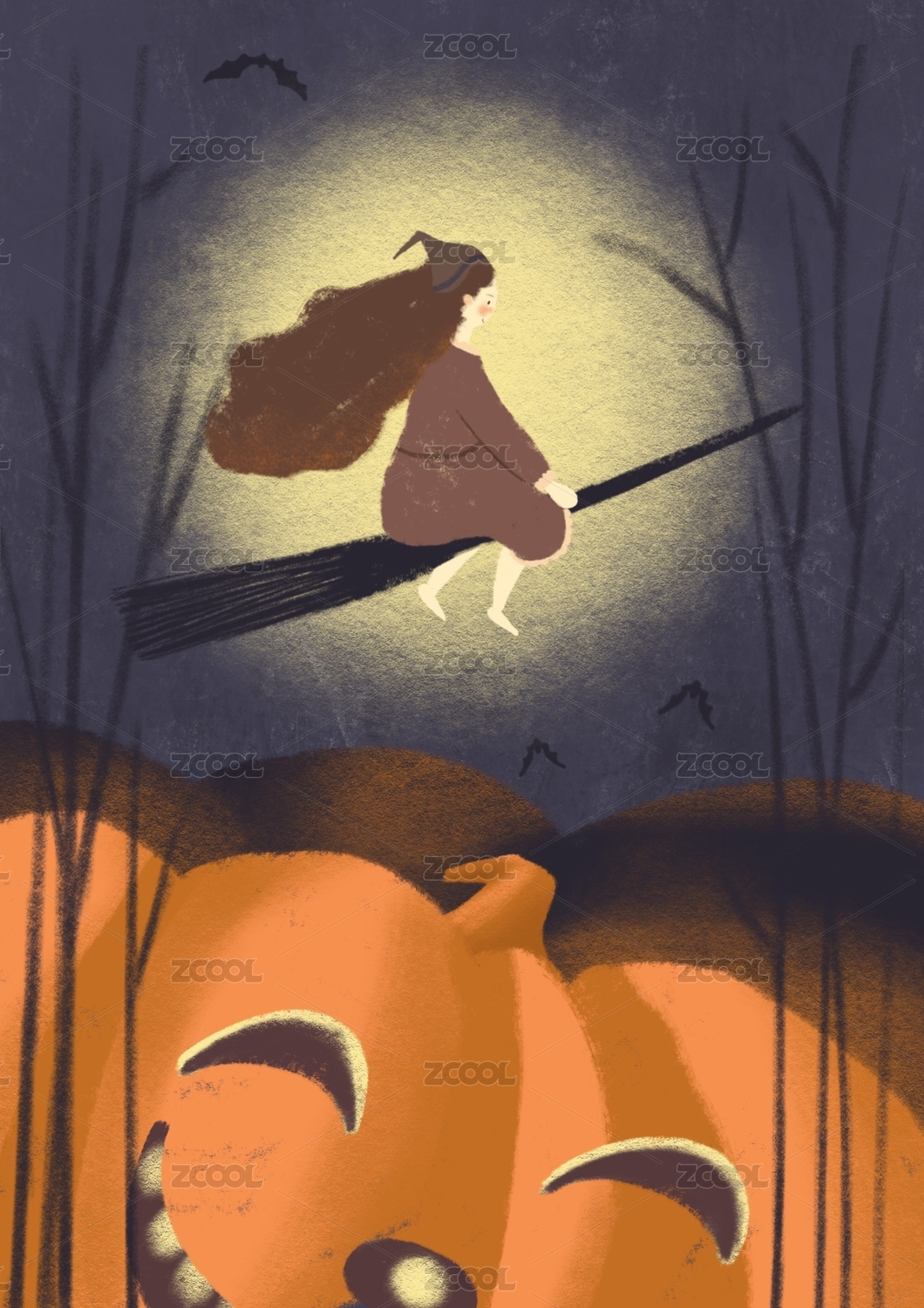 万圣节插画--骑扫把的小女孩