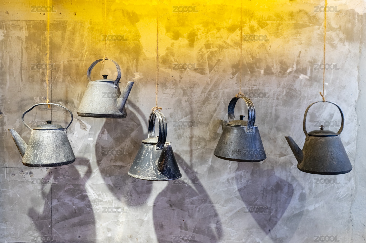墙壁上悬挂的传统的铁艺铁质烧水壶