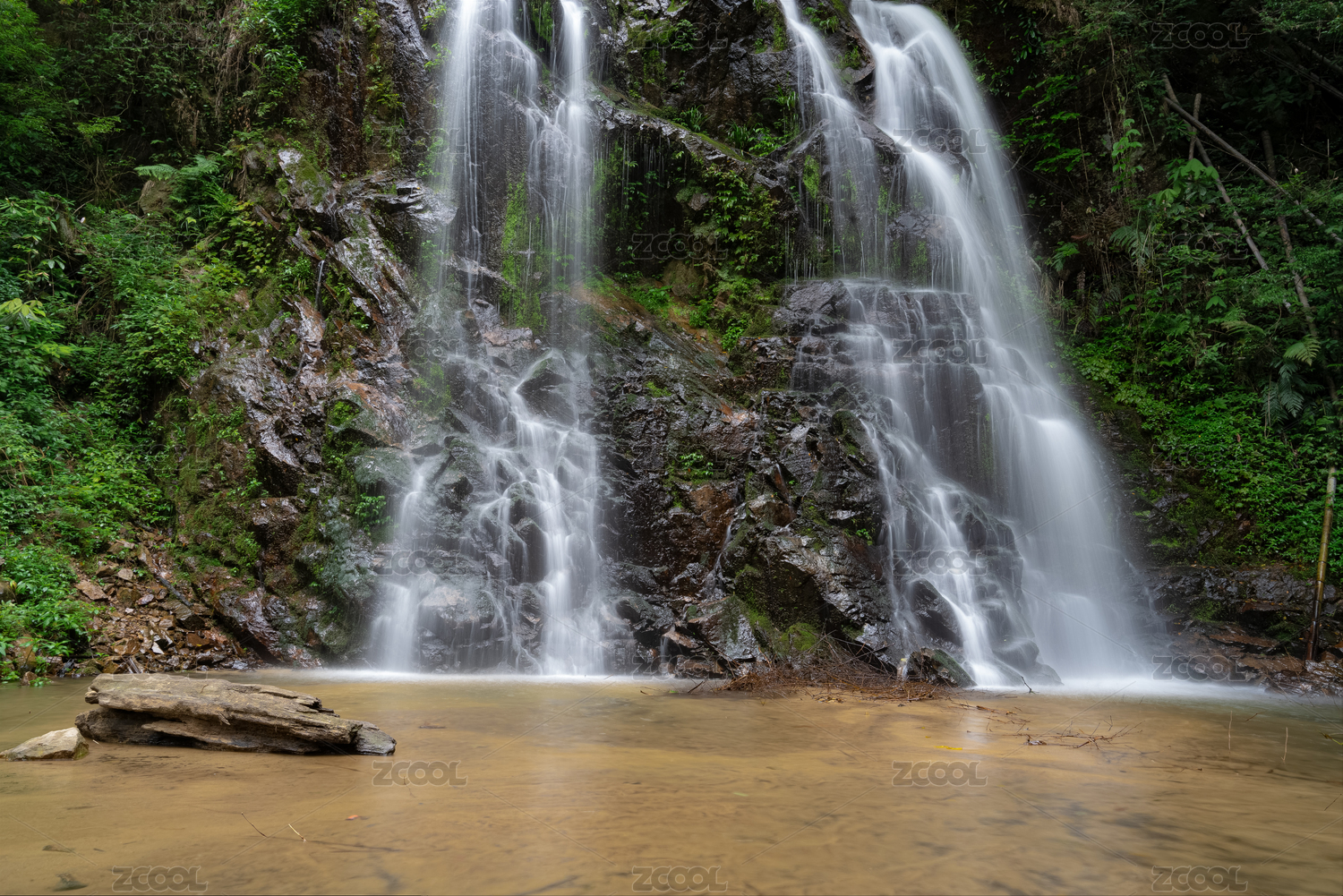 冬天里裸露的岩石崖壁上方挂满条状的冰棱