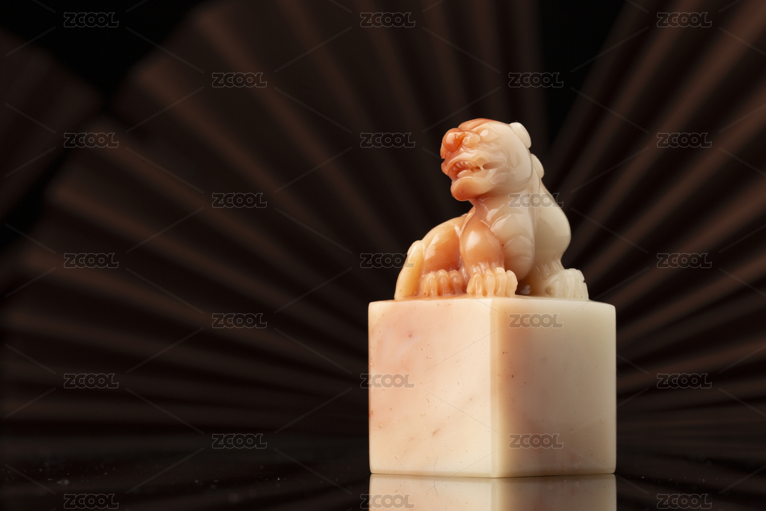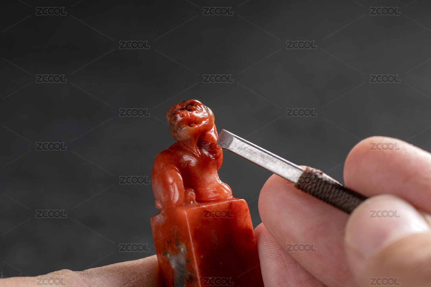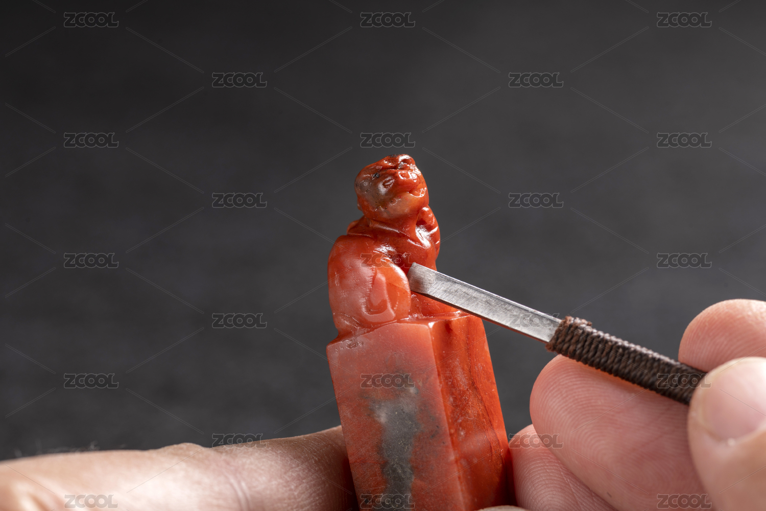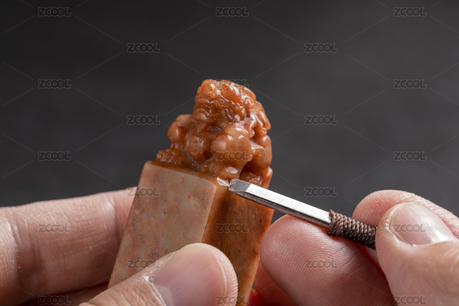 黑背景前双手正在雕刻石狮子石貔貅印章钮特写