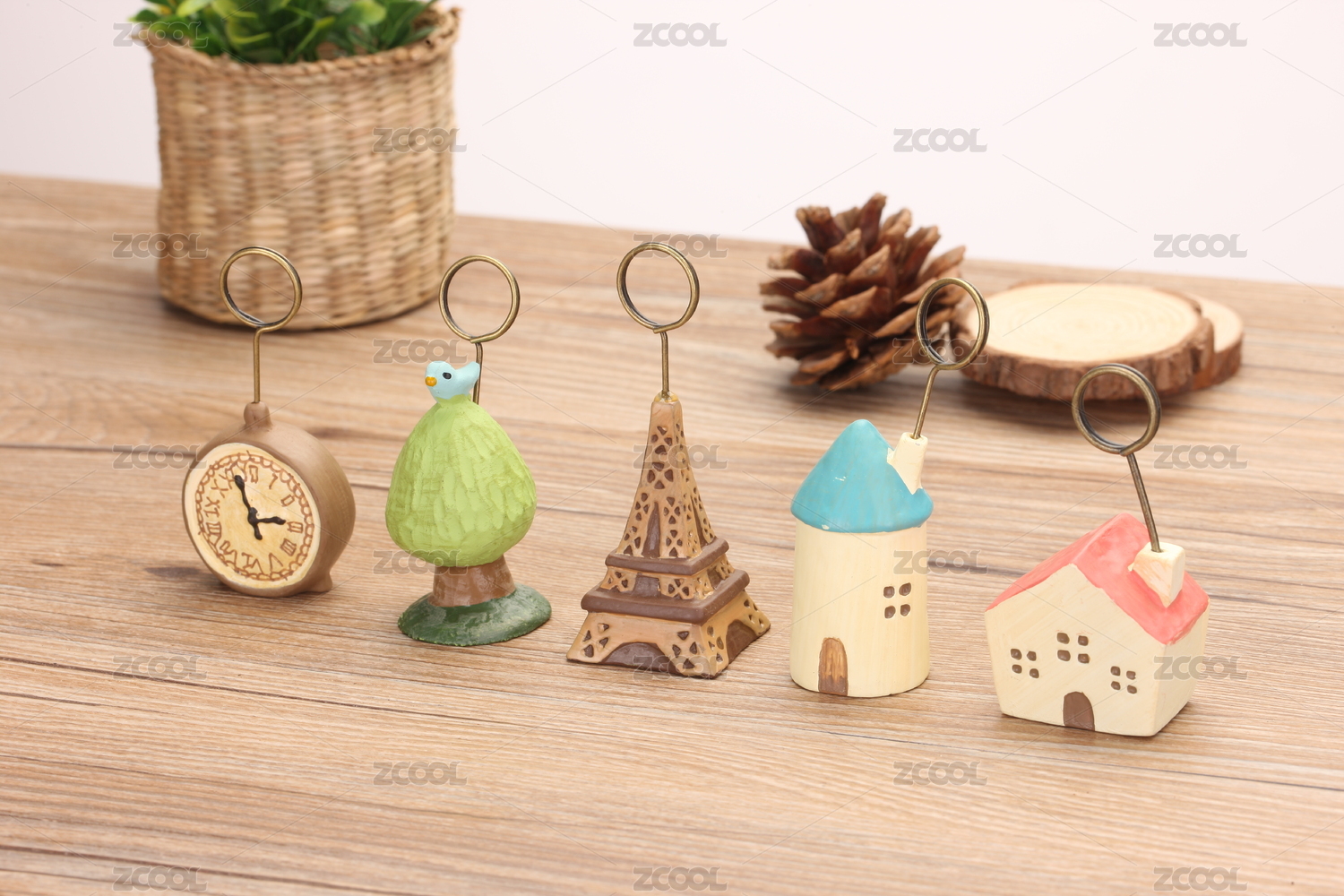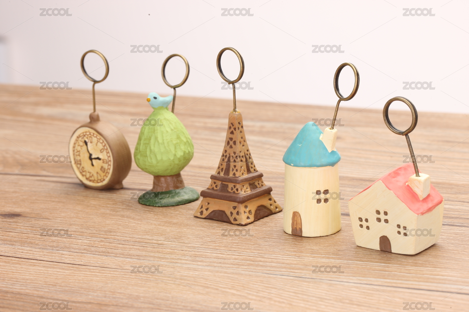 桌面上摆放的几个便签夹照片夹:埃菲尔铁塔、小房子、小鸟、小闹钟系列摆件