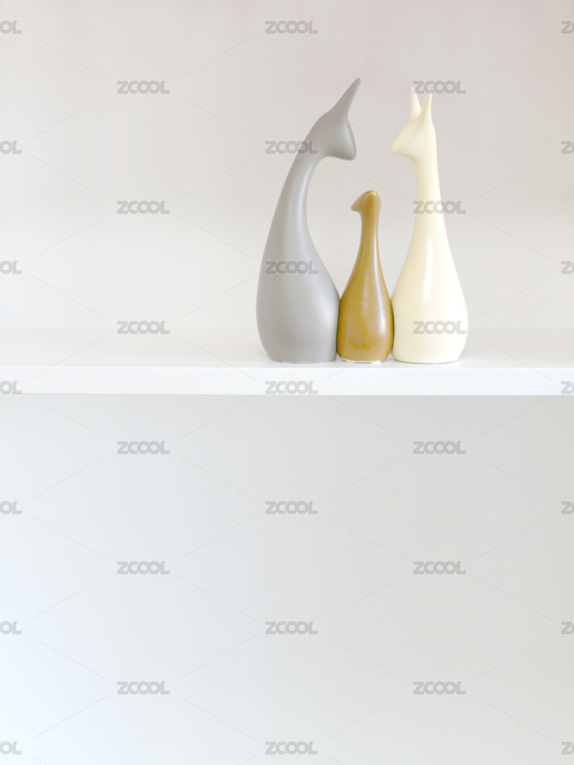 白色的隔板上摆放着的北欧瓷器摆件三口鹿三件套