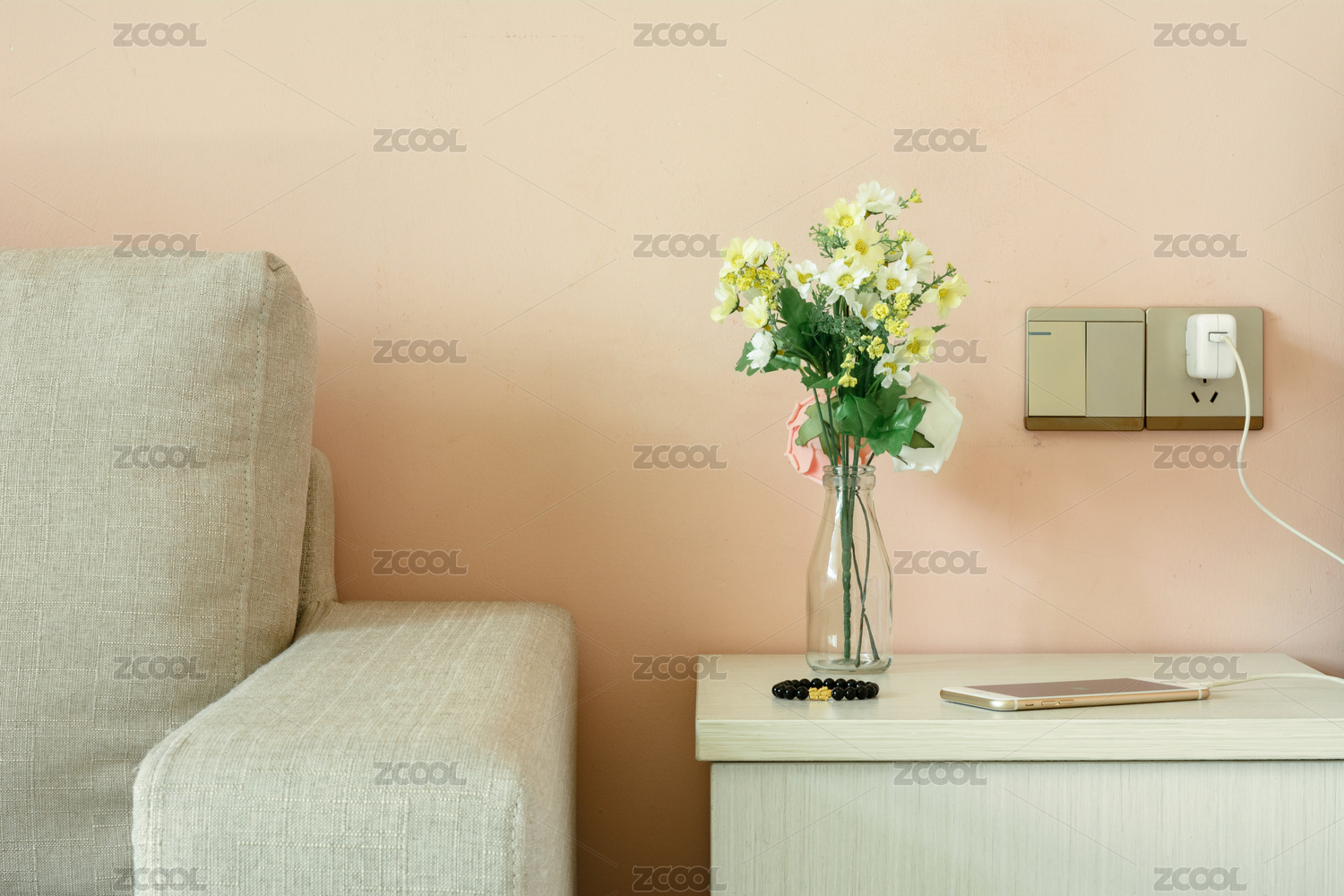 沙发旁柜子上充电的手机和假花