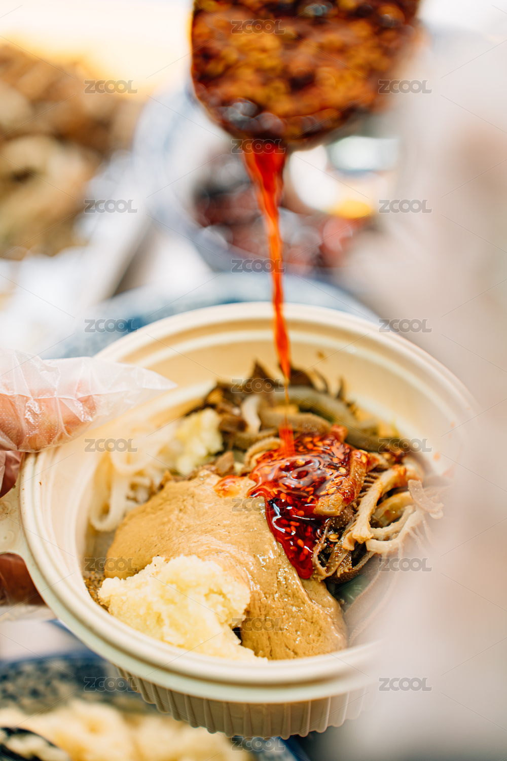 一碗红色爆肚米粉酸辣粉放在黑色底板上