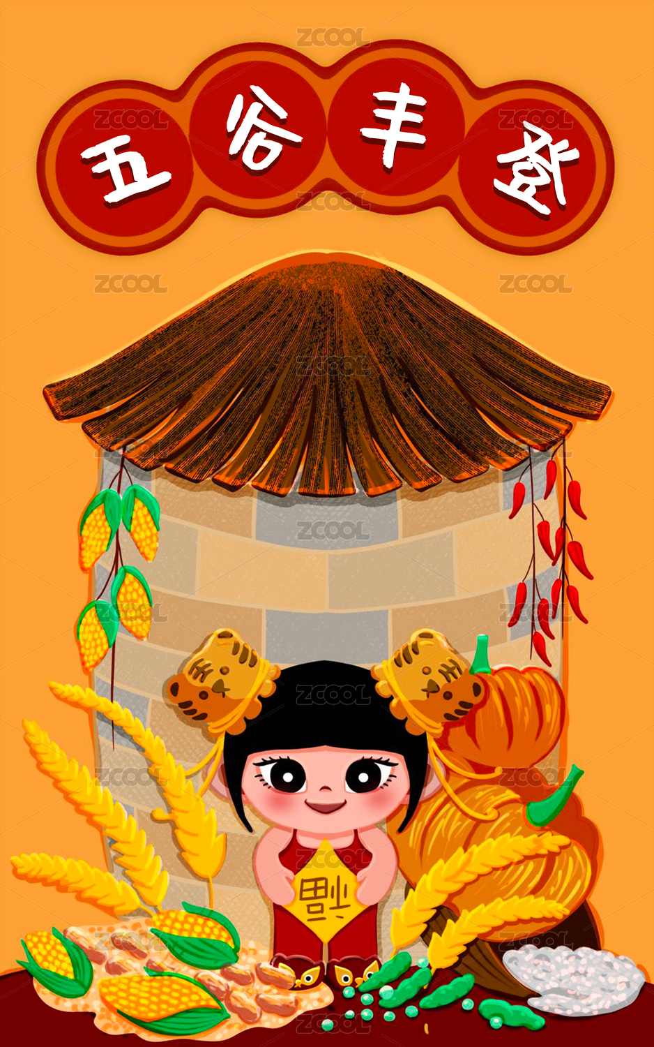 虎年新春老虎中国娃娃系列之五谷丰登插画