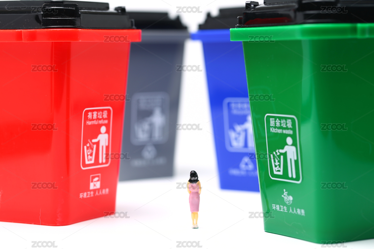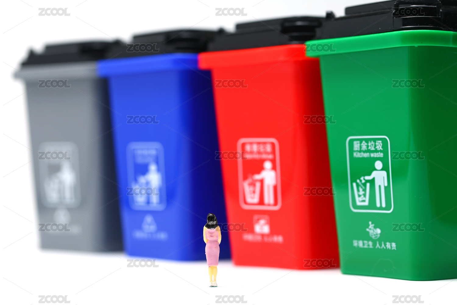穿着粉红色裙子的女人模型站在垃圾分类垃圾桶前,垃圾分类概念