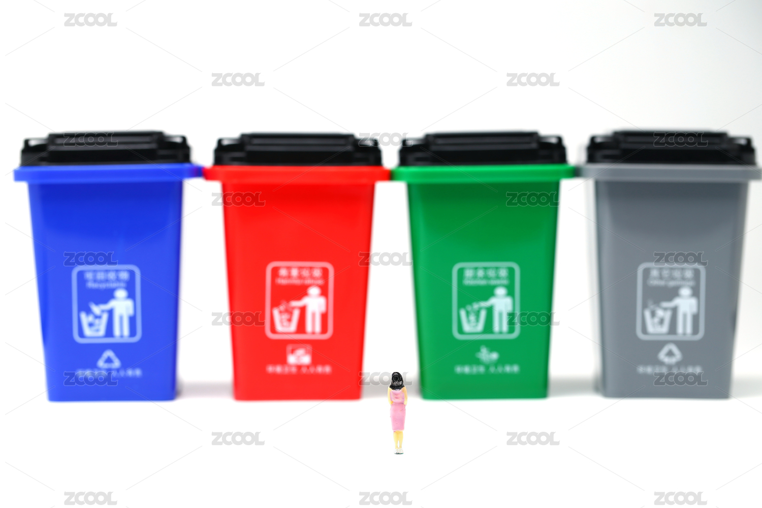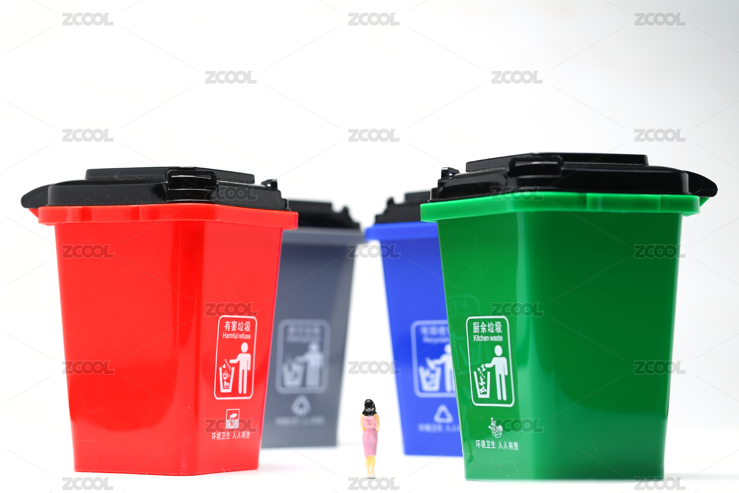 穿着粉红色裙子的女人模型站在垃圾分类垃圾桶前