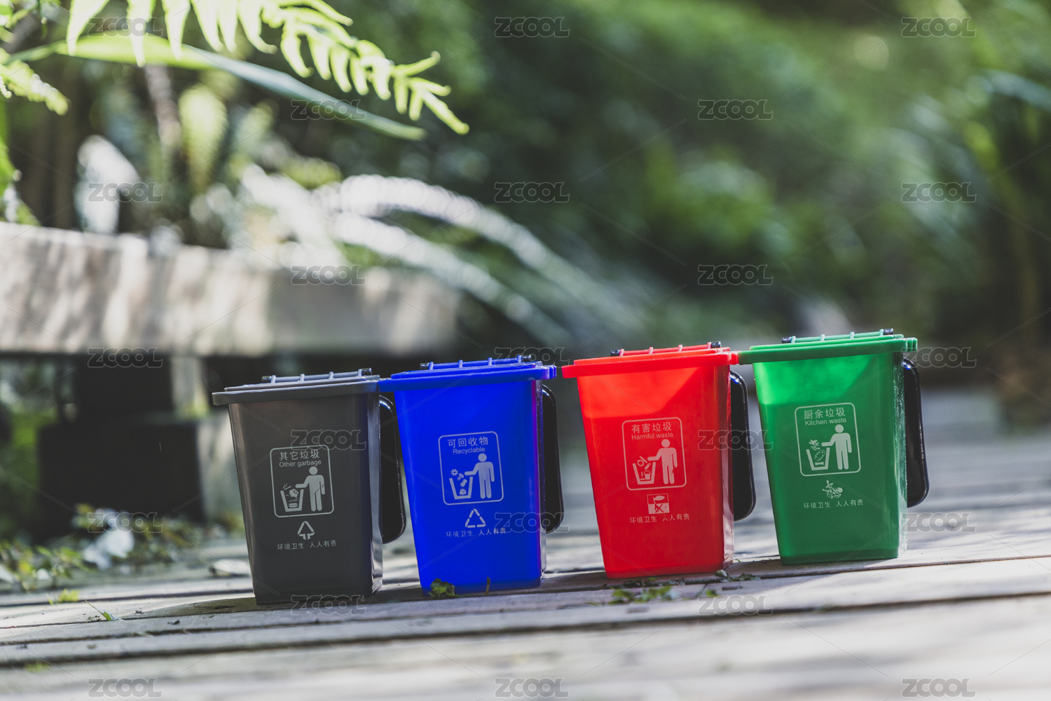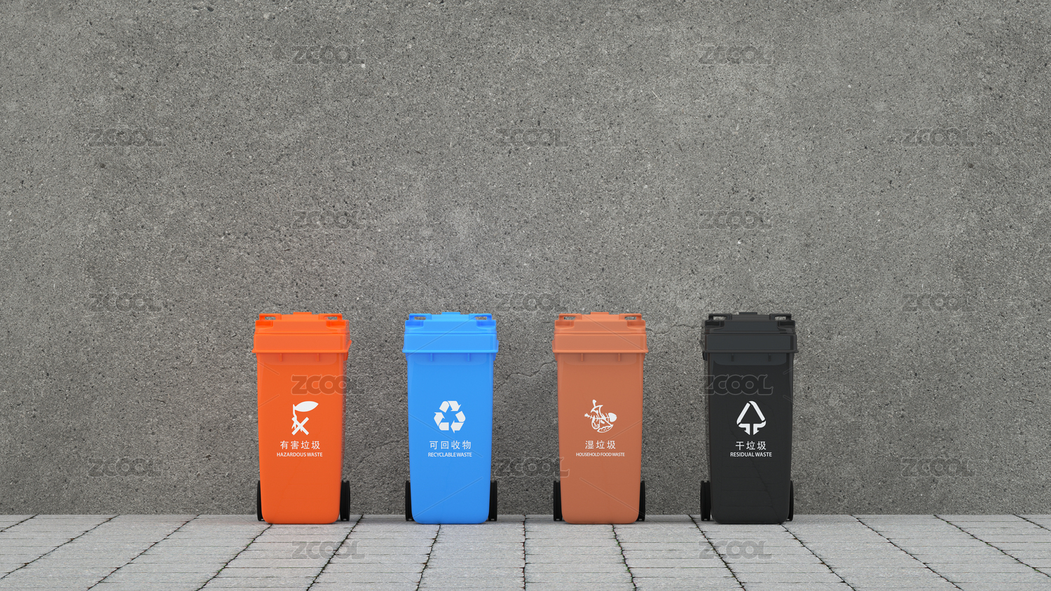 环保题材的垃圾分类专用垃圾桶和混凝土墙、水泥砖块地面