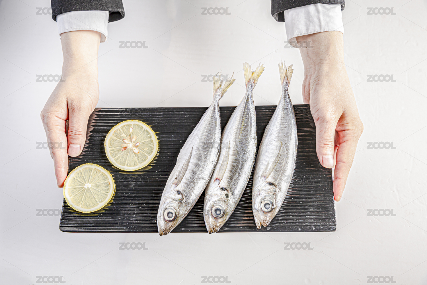 女性的双手捧着装了巴浪鱼的长方形盘子