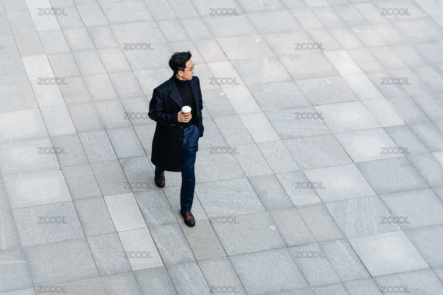 亚洲商务男士手持纸杯在户外行走