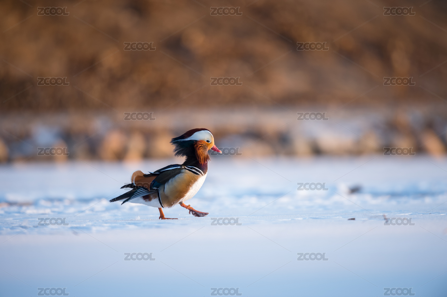 独自在雪地上行走的鸳鸯