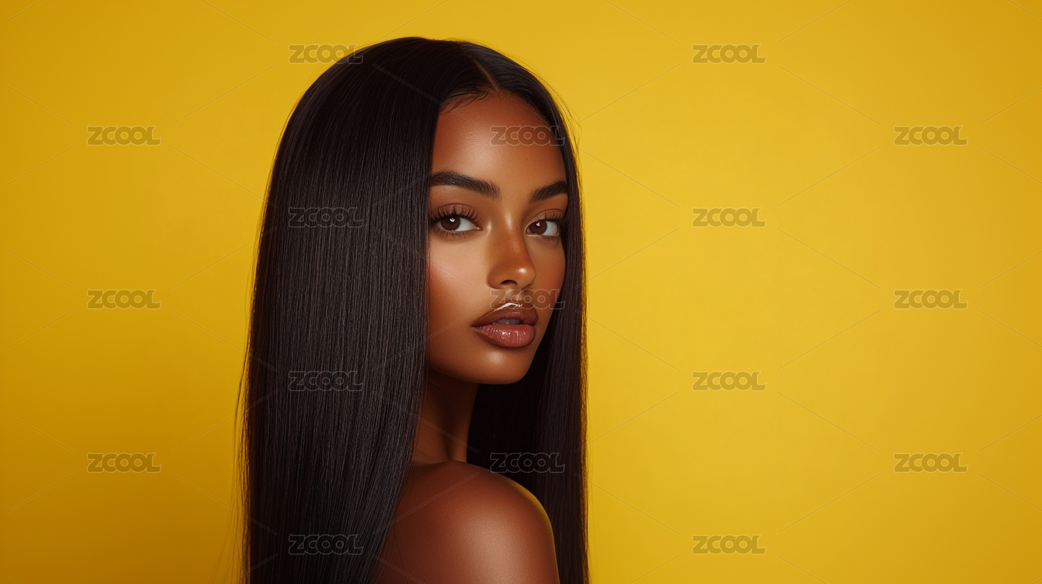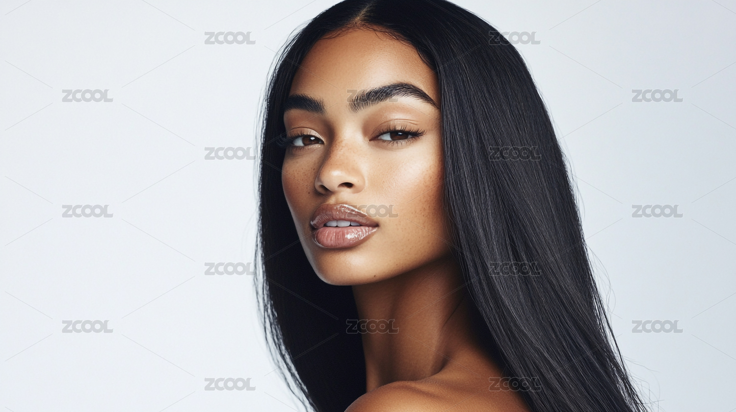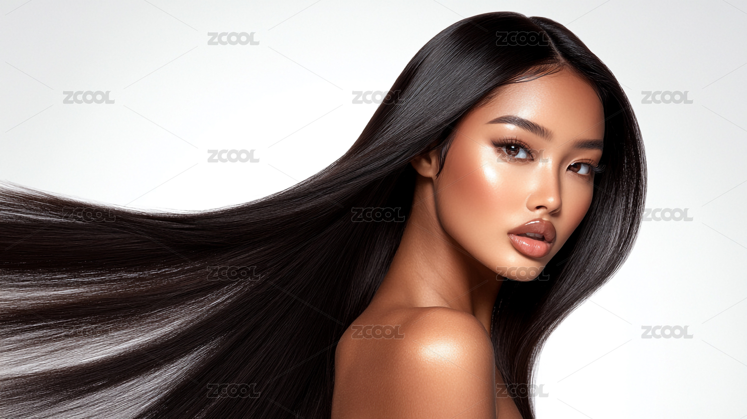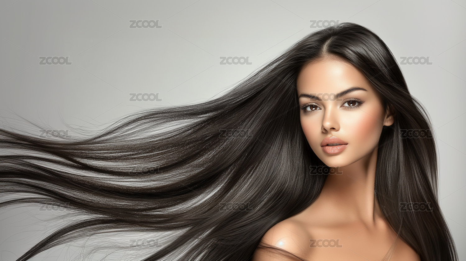 时尚优雅一头黑色长发的欧美女孩模特