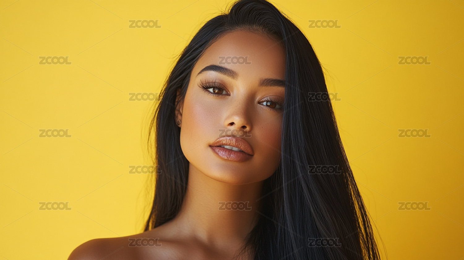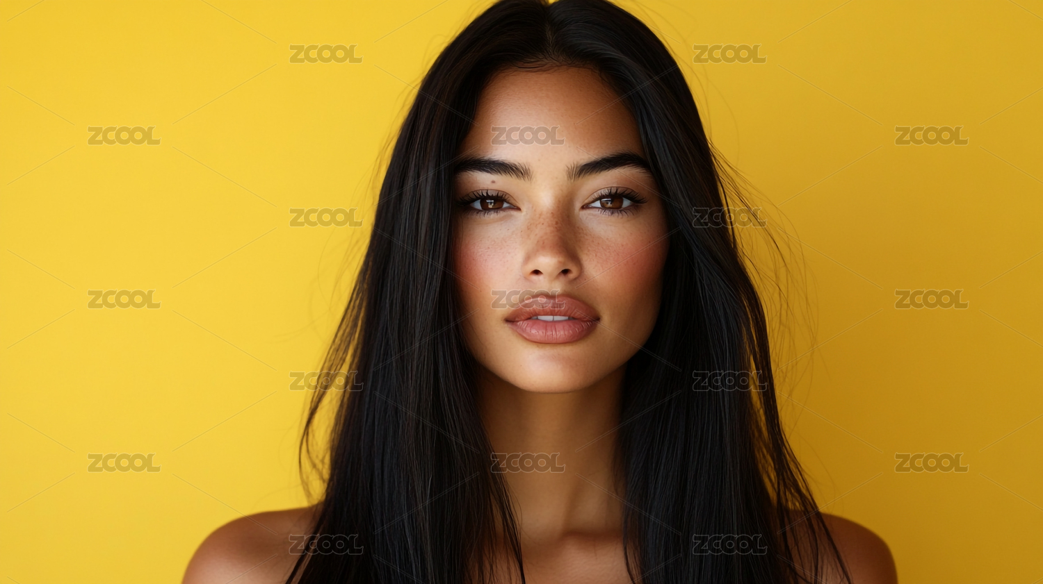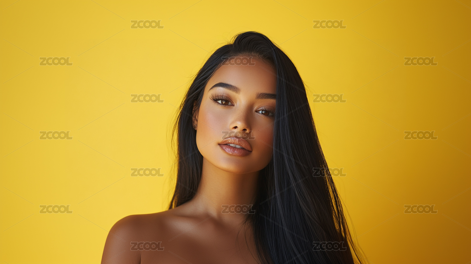 时尚优雅一头黑色长发的欧美女孩模特