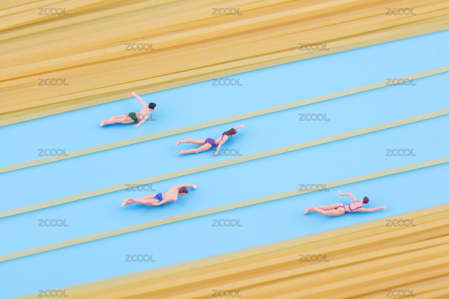 意大利面组成的赛道和游泳比赛的人偶