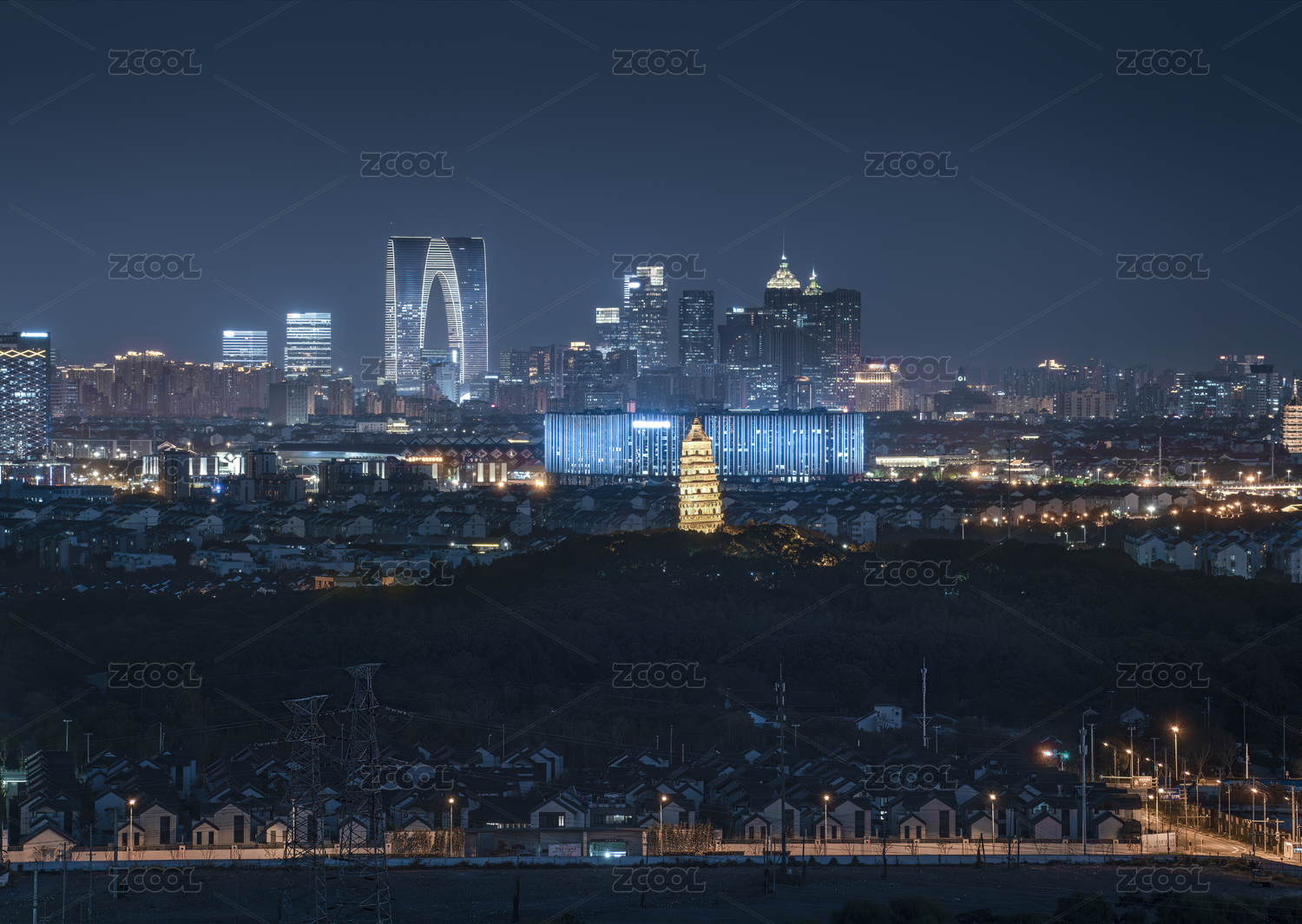 江苏苏州城市风光夜景-虎丘塔和东方之门