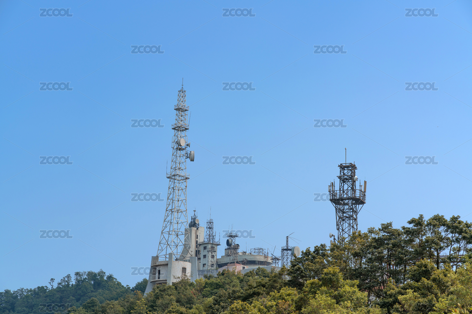 蓝天下,直立在绿植杂草上面的信号塔