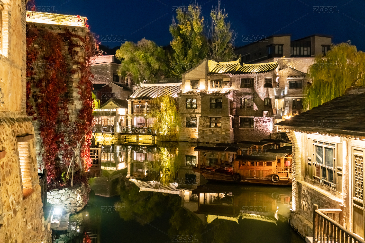 中国北京密云古北水镇夜景小桥流水人家夜色灯火通明
