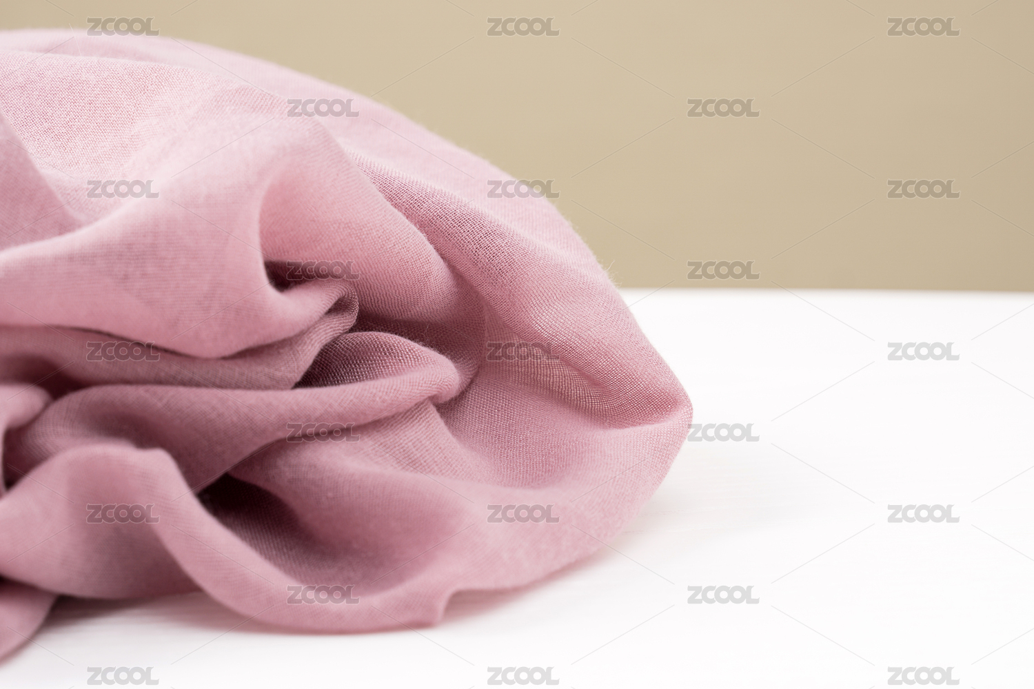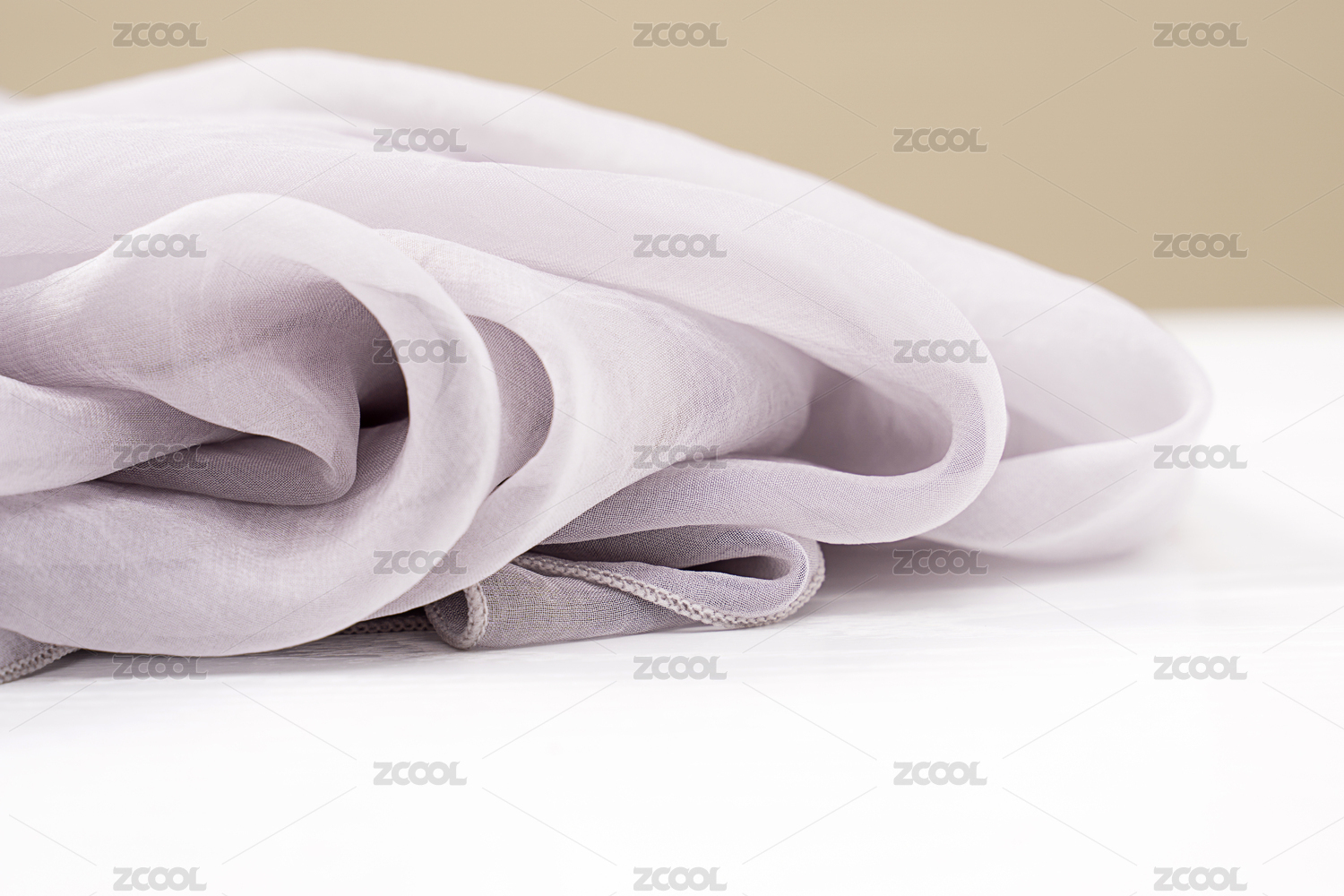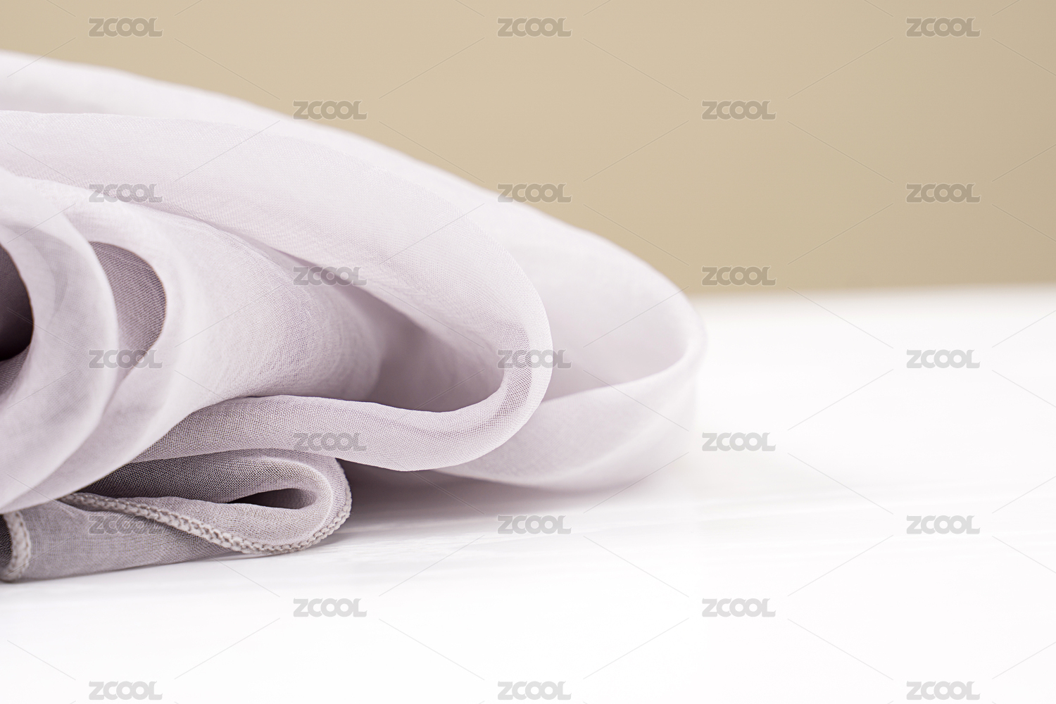 暖色背景前放在白色桌面上的灰色丝巾细节特写