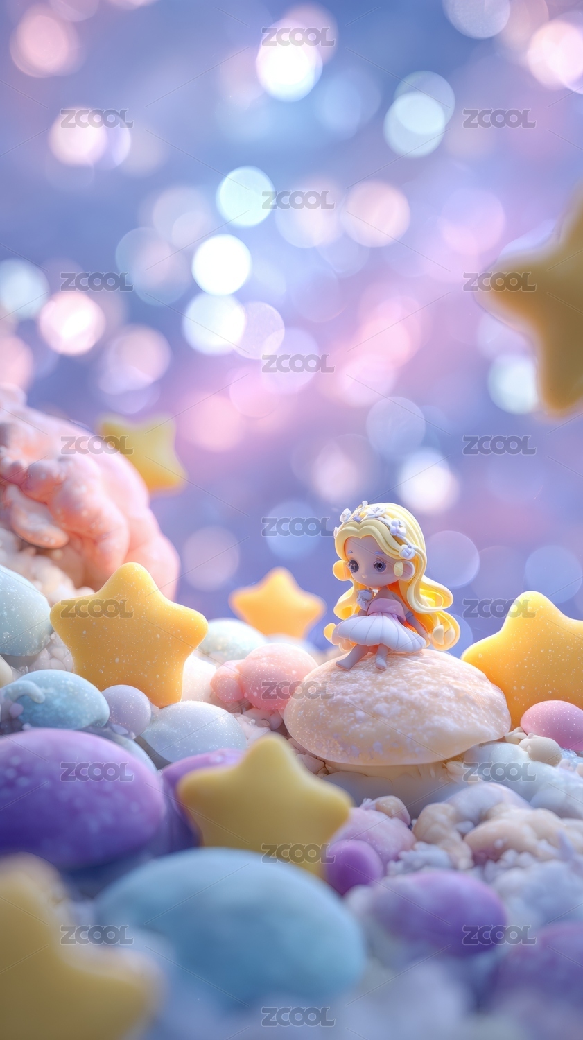 卡通小女巫扫帚黑猫糖果世界梦幻场景