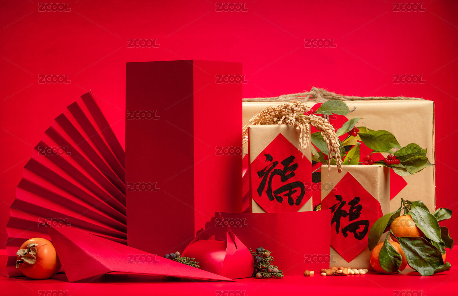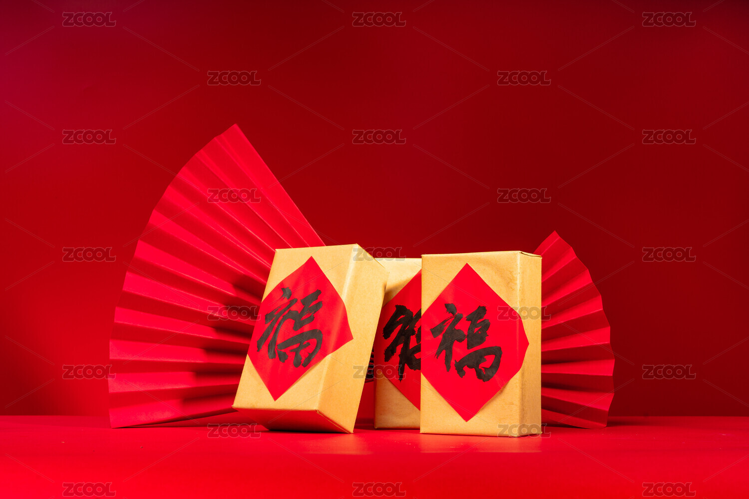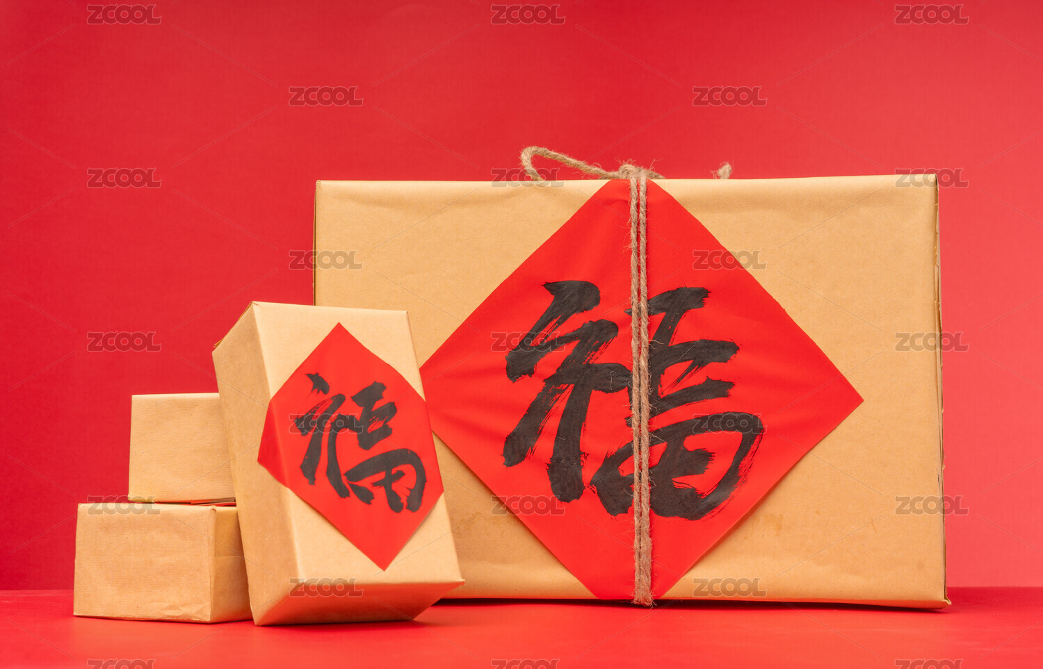 充满中国节日气息的背景下摆放着多个礼品盒及礼品